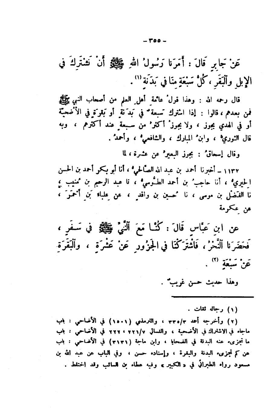 1132 - أَخْبَرَنَا أَحْمَدُ بْنُ عَبْدِ اللَّهِ الصَّالِحِيُّ، أَنا أَبُو بَكْرٍ أَحْمَدُ بْنُ الْحَسَنِ الْحِيرِيُّ، أَنا حَاجِبُ بْنُ أَحْمَدَ الطُّوسِيُّ، نَا عَبْدُ الرَّحِيمِ بْنُ مُنِيبٍ، نَا الْفَضْلُ بْنُ مُوسَى، نَا حُسَيْنُ بْنُ وَاقِدٍ، عَنْ عِلْبَاءَ بْنِ أَحْمَرَ، عَنْ عِكْرِمَةَ، عَنِ ابْنِ عَبَّاسٍ، قَالَ: «كُنَّا مَعَ النَّبِيِّ صَلَّى اللهُ عَلَيْهِ وَسَلَّمَ فِي سَفَرٍ، فَحَضَرَنَا النَّحْرُ، فَاشْتَرَكْنَا فِي الْجَزُورِ عَنْ عَشَرَةٍ، وَالْبَقَرَةِ عَنْ سَبْعَةٍ».