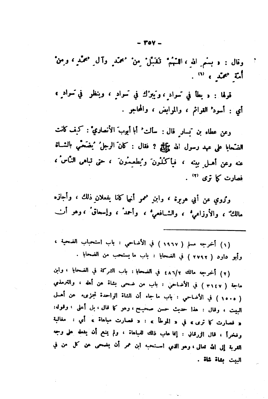 وَعَنْ عَطَاءِ بْنِ يَسَارٍ، قَالَ: سَأَلْتُ أَبَا أَيُّوبَ الأَنْصَارِيَّ: كَيْفَ كَانَتِ الضَّحَايَا عَلَى عَهْدِ رَسُولِ اللَّهِ صَلَّى اللهُ عَلَيْهِ وَسَلَّمَ؟ فَقَالَ: كَانَ الرَّجُلُ يُضَحِّي بِالشَّاةِ عَنْهُ، وَعَنْ أَهْلِ بَيْتِهِ، فَيَأْكُلُونَ وَيُطْعِمُونَ، حَتَّى تَبَاهَى النَّاسُ، فَصَارَتْ كَمَا تَرَى.