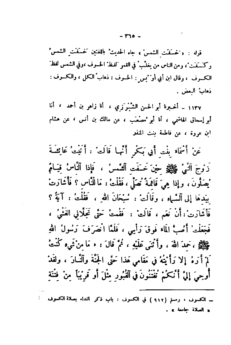 1137 - أَخْبَرَنَا أَبُو الْحَسَنِ الشِّيرَزِيُّ، أَنا زَاهِرُ بْنُ أَحْمَدَ، أَنا أَبُو إِسْحَاقَ الْهَاشِمِيُّ، أَنا أَبُو مُصْعَبٍ، عَنْ مَالِكِ بْنِ أَنَسٍ، عَنْ هِشَامِ بْنِ عُرْوَةَ، عَنْ فَاطِمَةَ بِنْتِ الْمُنْذِرِ، عَنْ أَسْمَاءَ بِنْتِ أَبِي بَكْرٍ أَنَّهَا، قَالَتْ: أَتَيْتُ عَائِشَةَ زَوْجَ النَّبِيِّ صَلَّى اللهُ عَلَيْهِ وَسَلَّمَ حِينَ خَسَفَتِ الشَّمْسُ، فَإِذَا النَّاسُ قِيَامٌ يُصَلُّونَ، وَإِذَا هِيَ قَائِمَةٌ تُصَلِّي، فَقُلْتُ: " مَا لِلنَّاسِ؟ فَأَشَارَتْ بِيَدِهَا إِلَى السَّمَاءِ، وَقَالَتْ: سُبْحَانَ اللَّهِ، فَقُلْتُ: آيَةٌ؟ فَأَشَارَتْ: أَنْ نَعَمْ، قَالَتْ: فَقُمْتُ حَتَّى تَجَلانِي الْغَشْيُ، فَجَعَلْتُ أَصُبُّ الْمَاءَ فَوْقَ رَأْسِي "، فَلَمَّا انْصَرَفَ رَسُولُ اللَّهِ صَلَّى اللهُ عَلَيْهِ وَسَلَّمَ، حَمِدَ اللَّهَ، وَأَثْنَى عَلَيْهِ، ثُمَّ قَالَ: " مَا مِنْ شَيْءٍ كُنْتُ لَمْ أَرَهُ إِلا رَأَيْتُهُ فِي مَقَامِي هَذَا حَتَّى الْجَنَّةَ وَالنَّارَ، وَلَقَدْ أُوحِيَ إِلَيَّ أَنَّكُمْ تُفْتَنُونَ فِي الْقُبُورِ مِثْلَ أَوْ قَرِيبًا مِنْ فِتْنَةِ