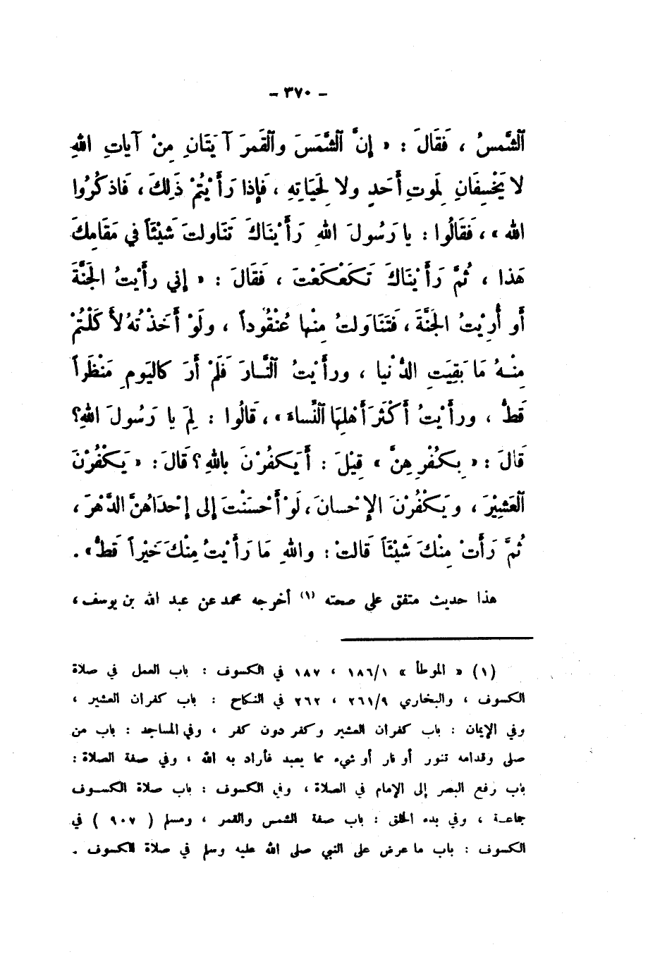 الشَّمْسُ، فَقَالَ: «إِنَّ الشَّمْسَ وَالْقَمَرَ آيَتَانِ مِنْ آيَاتِ اللَّهِ لَا يَخْسِفَانِ لِمَوْتِ أَحَدٍ وَلا لِحَيَاتِهِ، فَإِذَا رَأَيْتُمْ ذَلِكَ، فَاذْكُرُوا اللَّهَ»، فَقَالُوا: يَا رَسُولَ اللَّهِ، رَأَيْنَاكَ تَنَاوَلْتَ شَيْئًا فِي مَقَامِكَ هَذَا، ثُمَّ رَأَيْنَاكَ تَكَعْكَعْتَ، فَقَالَ: «إِنِّي رَأَيْتُ الْجَنَّةَ، أَوْ أُرِيتُ الْجَنَّةَ، فَتَنَاوَلْتُ مِنْهَا عُنْقُودًا، وَلَوْ أَخَذْتُهُ لأَكَلْتُمْ مِنْهُ مَا بَقِيَتِ الدُّنْيَا، وَرَأَيْتُ النَّارَ فَلَمْ أَرَ كَالْيَوْمِ مَنْظَرًا قَطُّ، وَرَأَيْتُ أَكْثَرَ أَهْلِهَا النِّسَاءَ»، قَالُوا: لِمَ يَا رَسُولَ اللَّهِ؟ قَالَ: «بِكُفْرِهِنَّ»، قِيلَ: أَيَكْفُرْنَ بِاللَّهِ؟ قَالَ: " يَكْفُرْنَ الْعَشِيرَ، وَيَكْفُرْنَ الإِحْسَانَ، لَوْ أَحْسَنْتَ إِلَى إِحْدَاهُنَّ الدَّهْرَ، ثُمَّ رَأَتْ مِنْكَ شَيْئًا، قَالَتْ: وَاللَّهِ مَا رَأَيْتُ مِنْكَ خَيْرًا قَطُّ ".