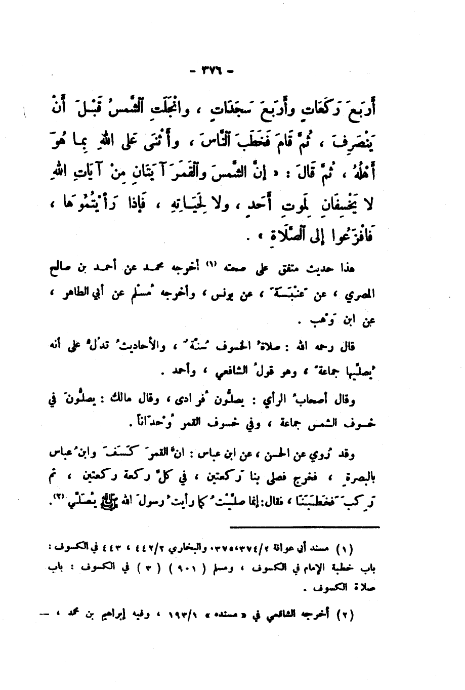 أَرْبَعَ رَكَعَاتٍ وَأَرْبَعَ سَجَدَاتٍ، وَانْجَلَتِ الشَّمْسُ قَبْلَ أَنْ يَنْصَرِفَ، ثُمَّ قَامَ فَخَطَبَ النَّاسَ، وَأَثْنَى عَلَى اللَّهِ بِمَا هُوَ أَهْلُهُ»، ثُمَّ قَالَ: «إِنَّ الشَّمْسَ وَالْقَمَرَ آيَتَانِ مِنْ آيَاتِ اللَّهِ لَا يَخْسِفَانِ لِمَوْتِ أَحَدٍ، وَلا لِحَيَاتِهِ، فَإِذَا رَأَيْتُمُوهَا، فَافْزَعُوا إِلَى الصَّلاةِ».