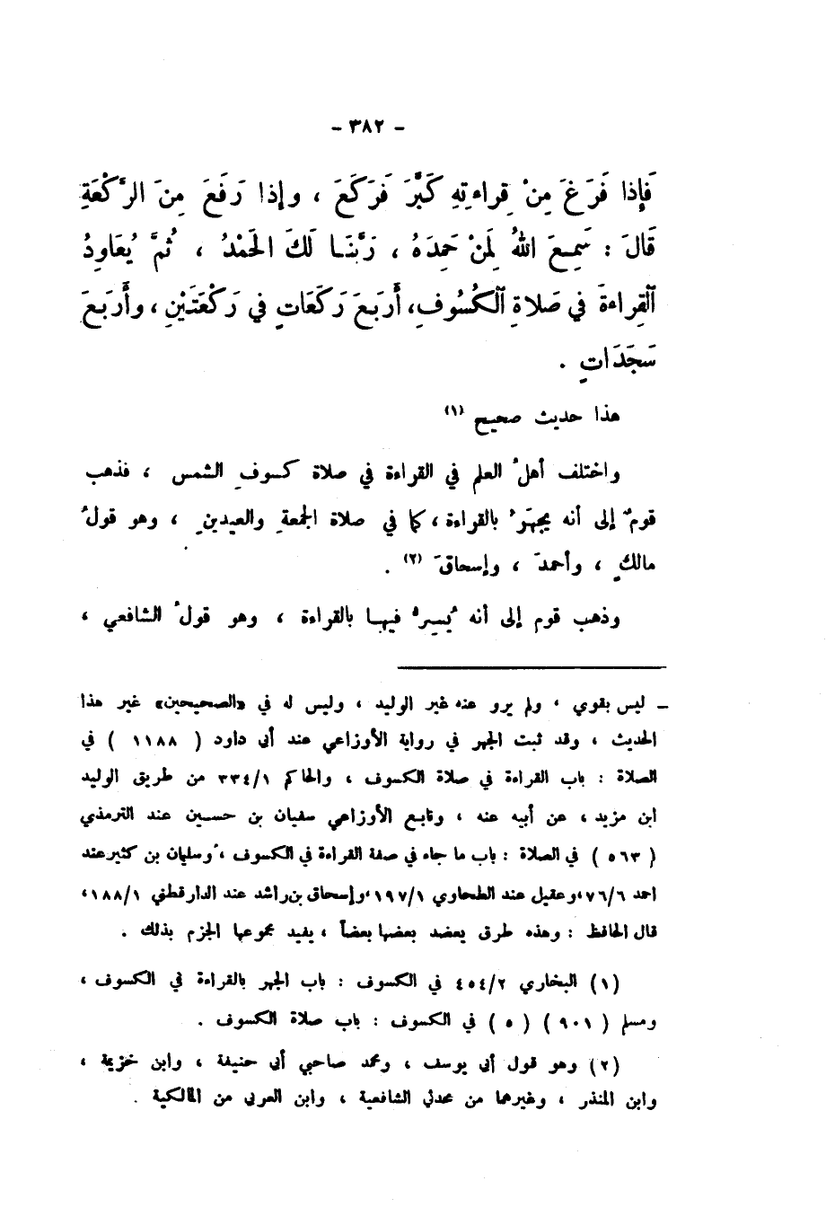 وَاخْتَلَفَ أَهْلُ الْعِلْمِ فِي الْقِرَاءَةِ فِي صَلاةِ كُسُوفِ الشَّمْسِ، فَذَهَبَ قَوْمٌ إِلَى أَنَّهُ يَجْهَرُ بِالْقِرَاءَةِ، كَمَا فِي صَلاةِ الْجُمُعَةِ وَالْعِيدَيْنِ، وَهُوَ قَوْلُ مَالِكٍ، وَأَحْمَدَ، وَإِسْحَاقَ.