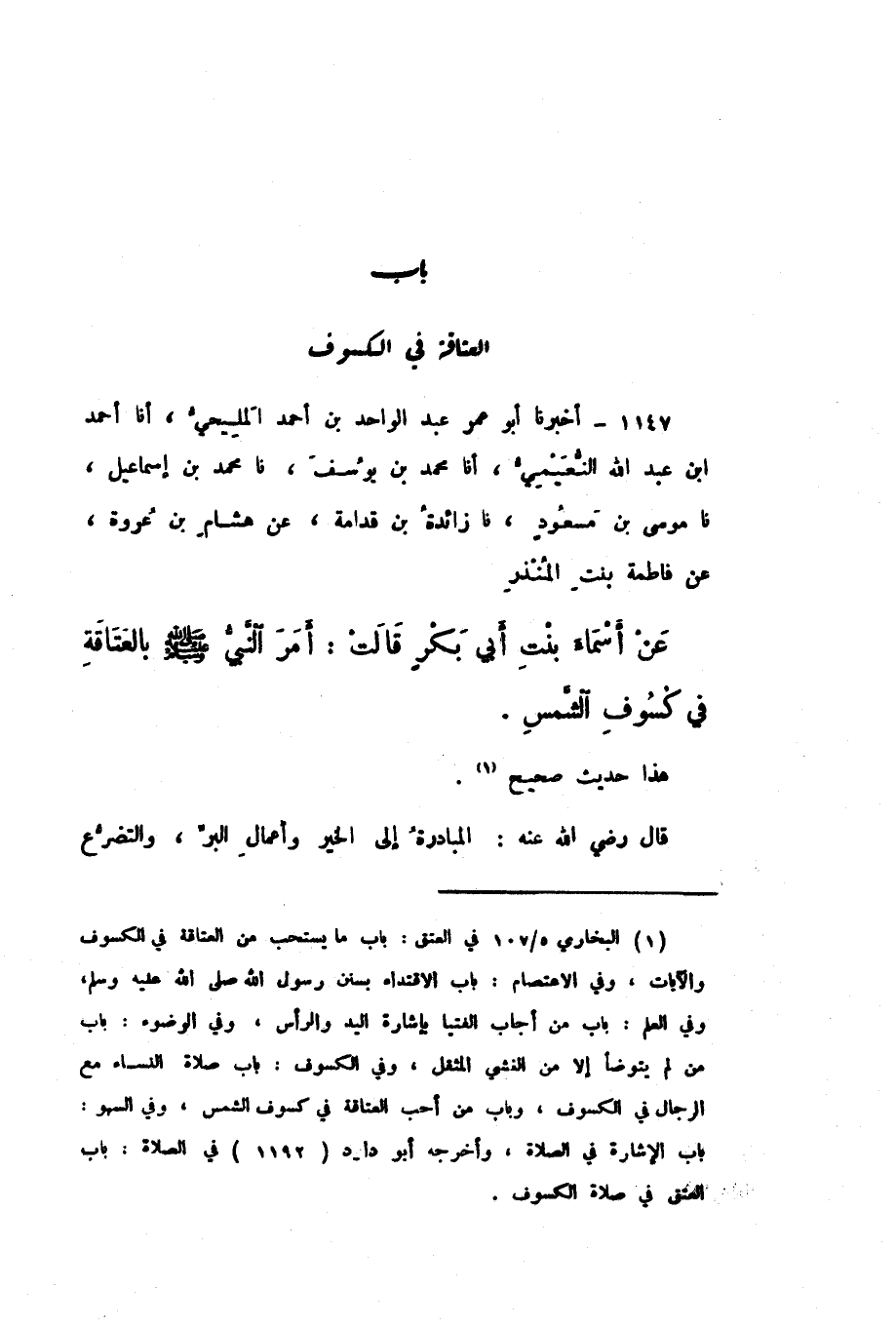 1147 - أَخْبَرَنَا أَبُو عُمَرَ عَبْدُ الْوَاحِدِ بْنُ أَحْمَدَ الْمَلِيحِيُّ، أَنا أَحْمَدُ بْنُ عَبْدِ اللَّهِ النُّعَيْمِيُّ، أَنا مُحَمَّدُ بْنُ يُوسُفَ، نَا مُحَمَّدُ بْنُ إِسْمَاعِيلَ، نَا مُوسَى بْنُ مَسْعُودٍ، نَا زَائِدَةُ بْنُ قُدَامَةَ، عَنْ هِشَامِ بْنِ عُرْوَةَ، عَنْ فَاطِمَةَ بِنْتِ الْمُنْذِرِ، عَنْ أَسْمَاءَ بِنْتِ أَبِي بَكْرٍ، قَالَتْ: «أَمَرَ النَّبِيُّ صَلَّى اللهُ عَلَيْهِ وَسَلَّمَ بِالْعَتَاقَةِ فِي كُسُوفِ الشَّمْسِ».