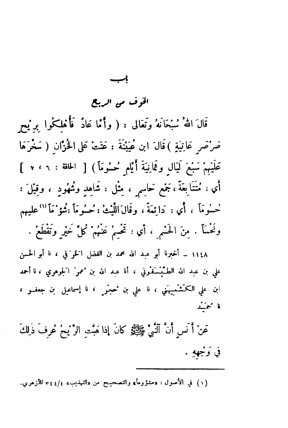 قَالَ اللَّهُ سُبْحَانَهُ وَتَعَالَى: {وَأَمَّا عَادٌ فَأُهْلِكُوا بِرِيحٍ صَرْصَرٍ عَاتِيَةٍ} [الحاقة: 6]، قَالَ ابْنُ عُيَيْنَةَ: عَتَتْ عَلَى الْخُزَّانِ {سَخَّرَهَا عَلَيْهِمْ سَبْعَ لَيَالٍ وَثَمَانِيَةَ أَيَّامٍ حُسُومًا} [الحاقة: 7] أَيْ: مُتَتَابِعَةً، جَمْعُ حَاسِمٍ، مِثْلُ: شَاهِدٍ وَشُهُودٍ، وَقِيلَ: حُسُومًا، أَيْ: دَائِمَةً، وَقَالَ اللَّيْثُ: حُسُومًا، شُؤْمًا عَلَيْهِمْ وَنَحْسًا.