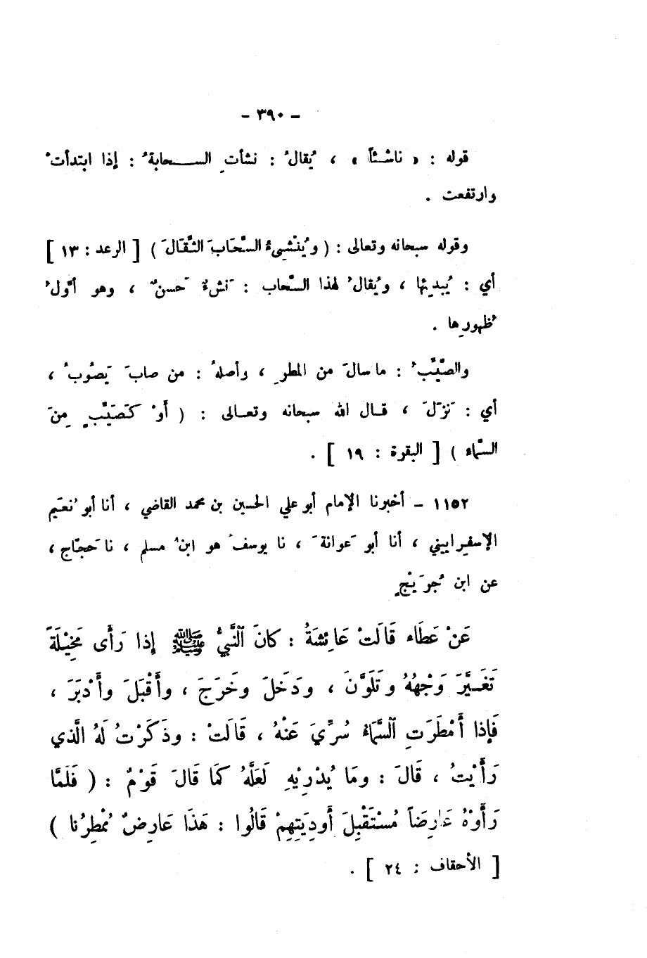 1152 - أَخْبَرَنَا الإِمَامُ أَبُو عَلِيٍّ الْحُسَيْنُ بْنُ مُحَمَّدٍ الْقَاضِي، أَنا أَبُو نُعَيْمٍ الإِسْفَرَايِينِيُّ، أَنا أَبُو عَوَانَةَ، نَا يُوسُفُ هُوَ ابْنُ مُسْلِمٍ، نَا حَجَّاجٌ، عَنِ ابْنِ جُرَيْجٍ، عَنْ عَطَاءٍ، قَالَتْ عَائِشَةُ: «كَانَ النَّبِيُّ صَلَّى اللهُ عَلَيْهِ وَسَلَّمَ إِذَا رَأَى مَخِيلَةً تَغَيَّرَ وَجْهُهُ وَتَلَوَّنَ، وَدَخَلَ وَخَرَجَ، وَأَقْبَلَ وَأَدْبَرَ، فَإِذَا أَمْطَرَتِ السَّمَاءُ سُرِّيَ عَنْهُ»، قَالَتْ: «وَذَكَرْتُ لَهُ الَّذِي رَأَيْتُ»، قَالَ: " وَمَا يُدْرِيكِ لَعَلَّهُ كَمَا قَالَ قَوْمٌ: {فَلَمَّا رَأَوْهُ عَارِضًا مُسْتَقْبِلَ أَوْدِيَتِهِمْ قَالُوا هَذَا عَارِضٌ مُمْطِرُنَا} [الْأَحْقَاف: 24] ".