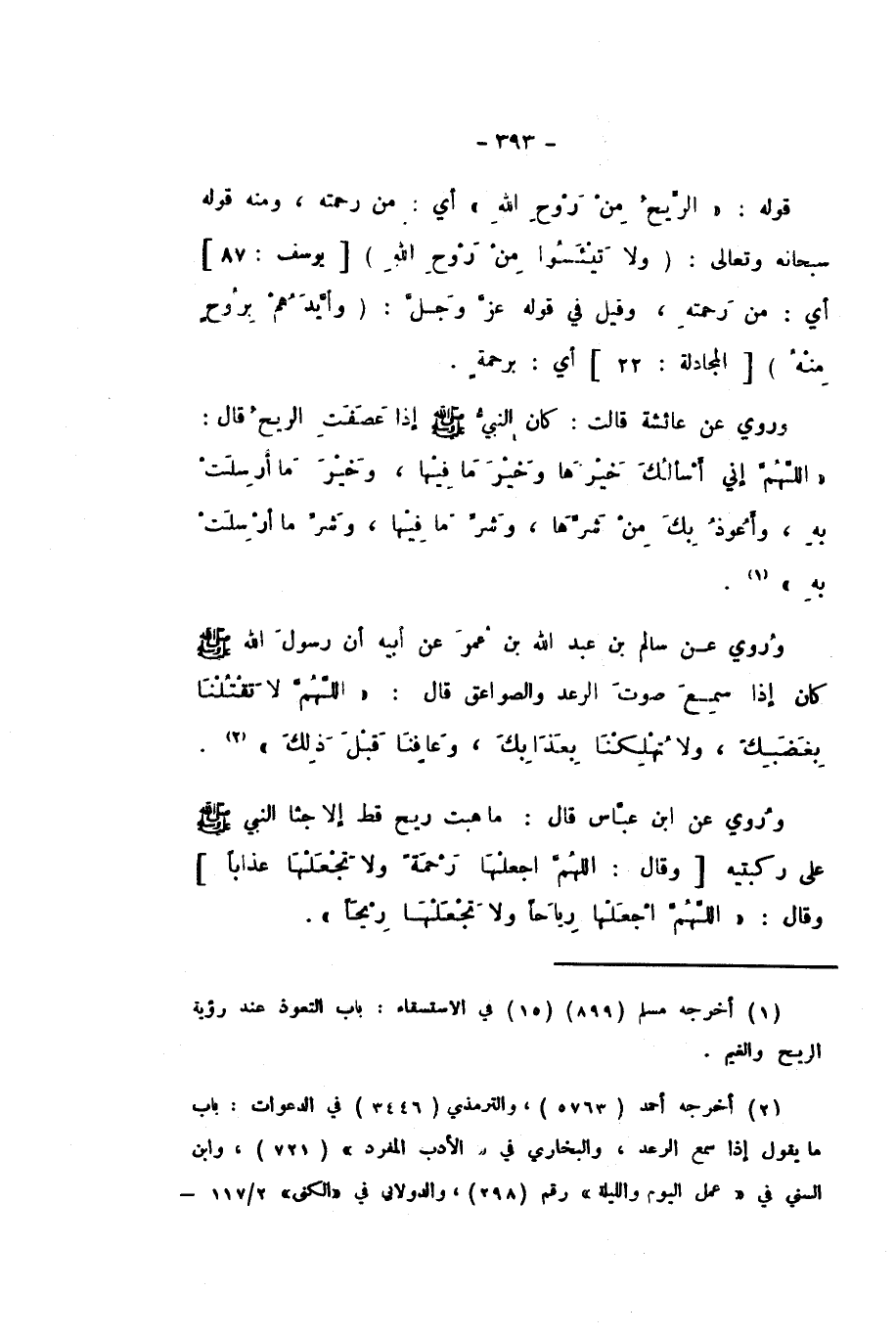وَرُوِيَ عَنِ ابْنِ عَبَّاسٍ، قَالَ: مَا هَبَّتْ رِيحٌ قَطُّ إِلا جَثَا النَّبِيُّ صَلَّى اللهُ عَلَيْهِ وَسَلَّمَ عَلَى رُكْبَتَيْهِ، وَقَالَ: «اللَّهُمَّ اجْعَلْهَا رَحْمَةً وَلا تَجْعَلْهَا عَذَابًا»، وَقَالَ: «اللَّهُمَّ اجْعَلْهَا رِيَاحًا وَلا تَجْعَلْهَا رِيحًا».