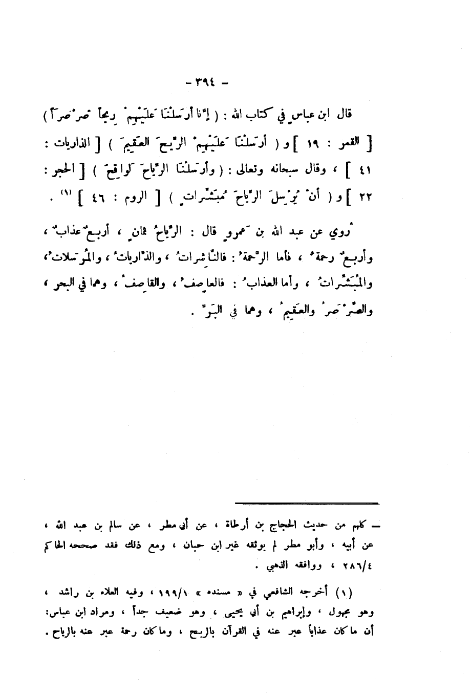 رُوِيَ عَنْ عَبْدِ اللَّهِ بْنِ عَمْرٍو، قَالَ: الرِّيَاحُ ثَمَانٍ، أَرْبَعٌ عَذَابٌ، وَأَرْبَعٌ رَحْمَةٌ، فَأَمَّا الرَّحْمَةُ: فَالنَّاشِرَاتُ، وَالذَّارِيَاتُ، وَالْمُرْسَلاتُ، وَالْمُبَشِّرَاتُ، وَأَمَّا الْعَذَابُ: فَالْعَاصِفُ، وَالْقَاصِفُ، وَهُمَا فِي الْبَحْرِ، وَالصَّرْصَرُ، وَالْعَقِيمُ، وَهُمَا فِي الْبَرِّ