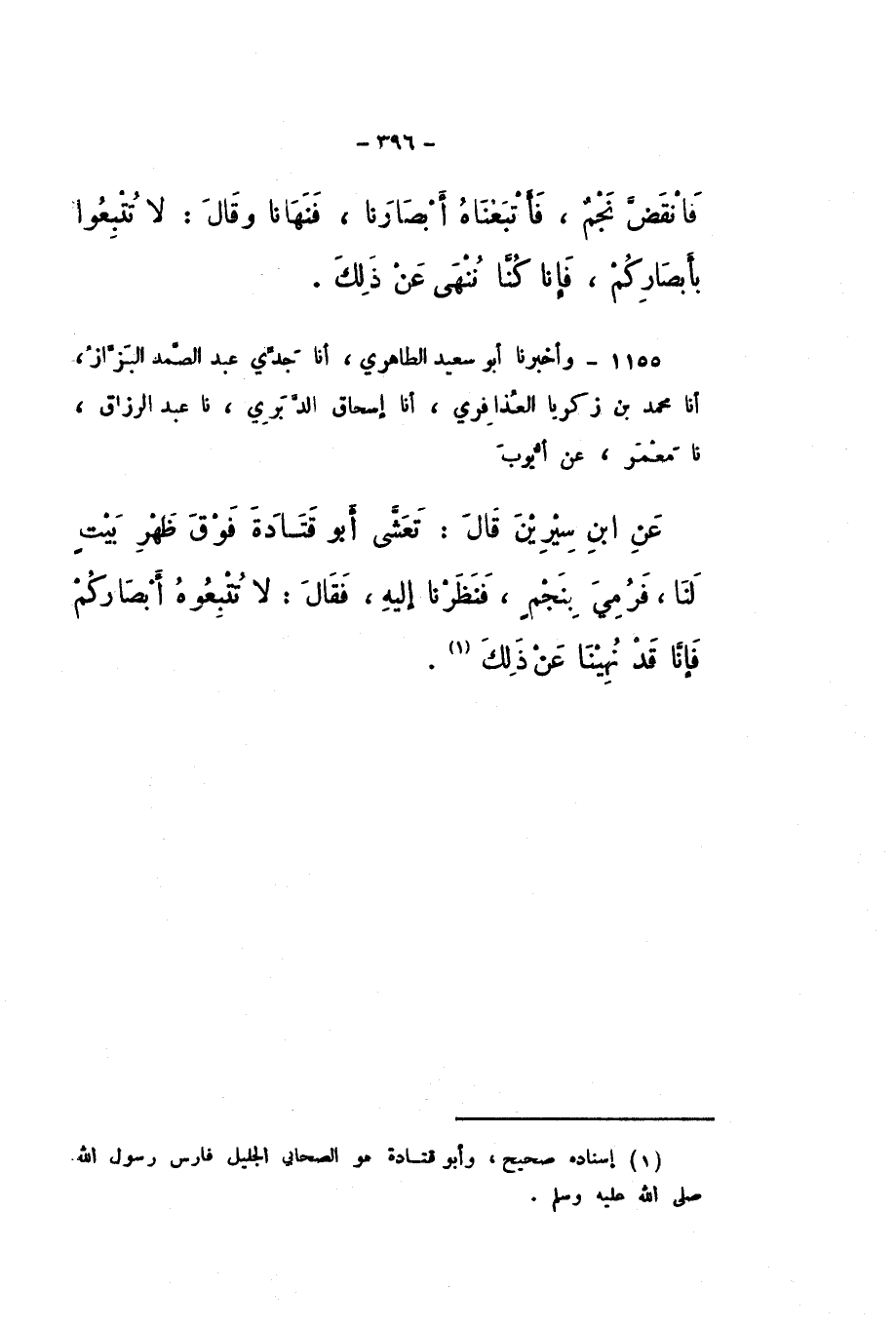 1155 - وَأَخْبَرَنَا أَبُو سَعِيدٍ الطَّاهِرِيُّ، أَنا جَدِّي عَبْدُ الصَّمَدِ الْبَزَّازُ، أَنا مُحَمَّدُ بْنُ زَكَرِيَّا الْعُذَافِرِيُّ، أَنا إِسْحَاقُ الدَّبَرِيُّ، نَا عَبْدُ الرَّزَّاقِ، نَا مَعْمَرٌ، عَنْ أَيُّوبَ، عَنِ ابْنِ سِيرِينَ، قَالَ: تَعَشَّى أَبُو قَتَادَةَ فَوْقَ ظَهْرِ بَيْتٍ لَنَا، فَرُمِيَ بِنَجْمٍ، فَنَظَرْنَا إِلَيْهِ، فَقَالَ: «لَا تُتْبِعُوهُ أَبْصَارَكُمْ فَإِنَّا قَدْ نُهِينَا عَنْ ذَلِكَ»