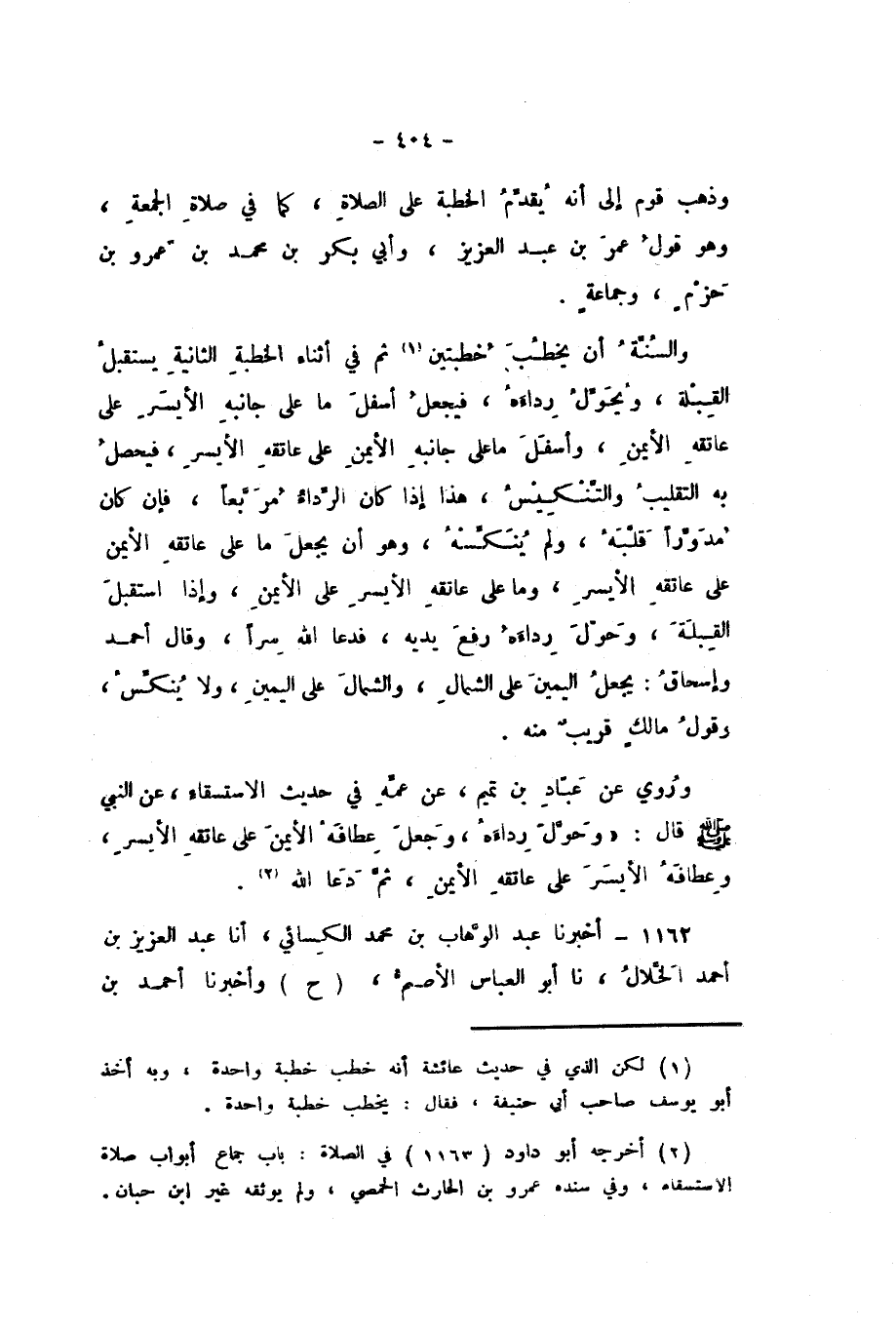 وَالسُّنَّةُ أَنْ يَخْطُبَ خُطْبَتَيْنِ، ثُمَّ فِي أَثْنَاءِ الْخُطْبَةِ الثَّانِيَةِ يَسْتَقْبِلُ الْقِبْلَةَ، وَيُحَوِّلُ رِدَاءَهُ، فَيَجْعَلُ أَسْفَلَ مَا عَلَى جَانِبِهِ الأَيْسَرِ عَلَى عَاتِقِهِ الأَيْمَنِ، وَأَسْفَلَ مَا عَلَى جَانِبِهِ الأَيْمَنِ عَلَى عَاتِقِهِ الأَيْسَرِ، فَيَحْصُلُ بِهِ التَّقْلِيبُ وَالتَّنْكِيسُ، هَذَا إِذَا كَانَ الرِّدَاءُ مُرَبَّعًا، فَإِنْ كَانَ مُدَوَّرًا قَلَّبَهُ، وَلَمْ يُنَكِّسْهُ، وَهُوَ أَنْ يَجْعَلَ مَا عَلَى عَاتِقِهِ الأَيْمَنِ عَلَى عَاتِقِهِ الأَيْسَرِ، وَمَا عَلَى عَاتِقِهِ الأَيْسَرِ عَلَى الأَيْمَنِ، وَإِذَا اسْتَقْبَلَ الْقِبْلَةَ، وَحَوَّلَ رِدَاءَهُ رَفَعَ يَدَيْهِ، فَدَعَا اللَّهَ سِرًّا، وَقَالَ أَحْمَدُ، وَإِسْحَاقُ: يَجْعَلُ الْيَمِينَ عَلَى الشِّمَالِ، وَالشِّمَالَ عَلَى الْيَمِينِ، وَلا يُنَكِّسُ، وَقَوْلُ مَالِكٍ قَرِيبٌ مِنْهُ.