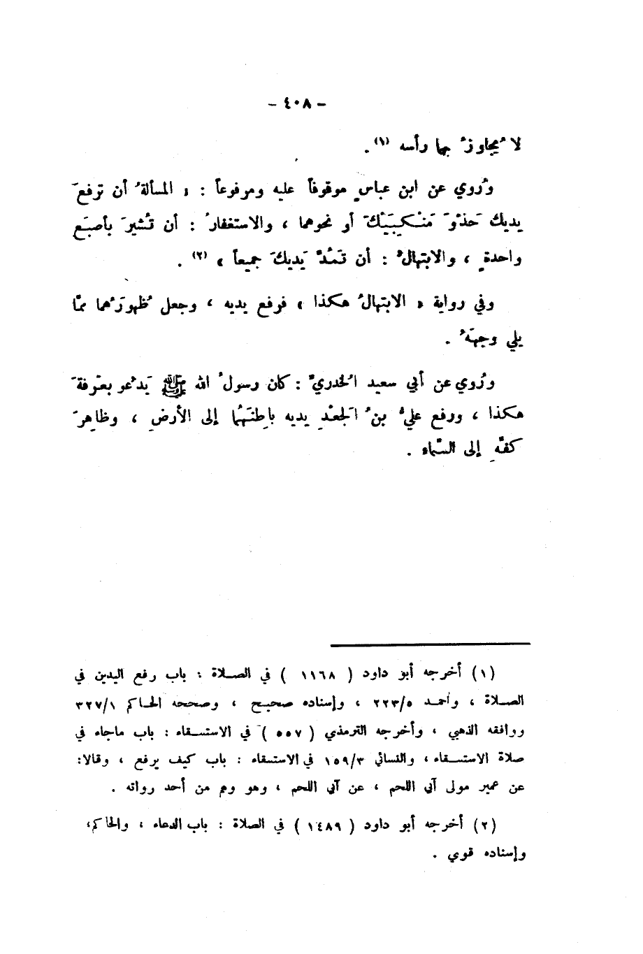 وَرُوِيَ عَنِ ابْنِ عَبَّاسٍ مَوْقُوفًا عَلَيْهِ وَمَرْفُوعًا: " الْمَسْأَلَةُ أَنْ تَرْفَعَ يَدَيْكَ حَذْوَ مَنْكِبَيْكَ، أَوْ نَحْوَهُمَا، وَالاسْتِغْفَارُ: أَنْ تُشِيرَ بِأُصْبُعٍ وَاحِدَةٍ، وَالابْتِهَالُ: أَنْ تَمُدَّ يَدَيْكَ جَمِيعًا ".