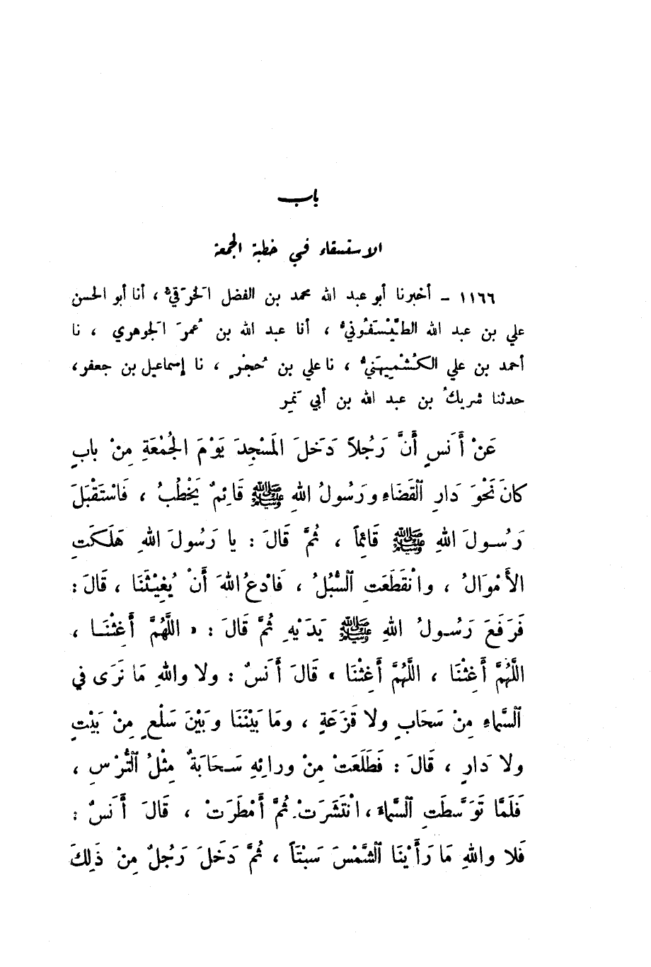 1166 - أَخْبَرَنَا أَبُو عَبْدِ اللَّهِ مُحَمَّدُ بْنُ الْفَضْلِ الْخَرَقِيُّ، أَنا أَبُو الْحَسَنِ عَلِيُّ بْنُ عَبْدِ اللَّهِ الطَّيْسَفُونِيُّ، أَنا عَبْدُ اللَّهِ بْنُ عُمَرَ الْجَوْهَرِيُّ، نَا أَحْمَدُ بْنُ عَلِيٍّ الْكُشْمِيهَنِيُّ، نَا عَلِيُّ بْنُ حُجْرٍ، نَا إِسْمَاعِيلُ بْنُ جَعْفَرٍ، حَدَّثَنَا شَرِيكُ بْنُ عَبْدِ اللَّهِ بْنِ أَبِي نَمِرٍ، عَنِ أَنَسٍ، أَنَّ رَجُلا دَخَلَ الْمَسْجِدَ يَوْمَ الْجُمُعَةِ مِنْ بَابٍ كَانَ نَحْوَ دَارِ الْقَضَاءِ، وَرَسُولُ اللَّهِ صَلَّى اللهُ عَلَيْهِ وَسَلَّمَ قَائِمٌ يَخْطُبُ، فَاسْتَقْبَلَ رَسُولَ اللَّهِ صَلَّى اللهُ عَلَيْهِ وَسَلَّمَ قَائِمًا، ثُمَّ قَالَ: يَا رَسُولَ اللَّهِ، هَلَكَتِ الأَمْوَالُ، وَانْقَطَعَتِ السُّبُلُ، فَادْعُ اللَّهَ أَنْ يُغِيثَنَا، قَالَ: فَرَفَعَ رَسُولُ اللَّهِ صَلَّى اللهُ عَلَيْهِ وَسَلَّمَ يَدَيْهِ، ثُمَّ قَالَ: «اللَّهُمَّ أَغِثْنَا، اللَّهُمَّ أَغِثْنَا، اللَّهُمَّ أَغِثْنَا»، قَالَ أَنَسٌ: وَلا وَاللَّهِ مَا نَرَى فِي السَّمَاءِ مِنْ سَحَابٍ وَلا قَزَعَةٍ، وَمَا بَيْنَنَا وَبَيْنَ سَلْعٍ مِنْ بَيْتٍ وَلا دَارٍ، قَالَ: فَطَلَعَتْ مِنْ وَرَائِهِ سَحَابَةٌ مِثْلُ التُّرْسِ، فَلَمَّا تَوَسَّطَتِ السَّمَاءَ، انْتَشَرَتْ ثُمَّ أَمْطَرَتْ، قَالَ أَنَسٌ: فَلا وَاللَّهِ مَا رَأَيْنَا الشَّمْسَ سَبْتًا، ثُمَّ دَخَلَ رَجُلٌ مِنْ ذَلِكَ