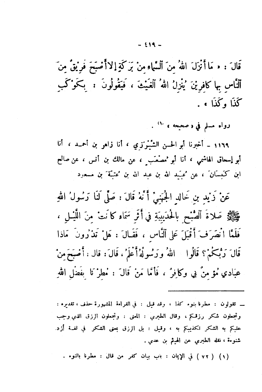 1169 - أَخْبَرَنَا أَبُو الْحَسَنِ الشِّيرَزِيُّ، أَنا زَاهِرُ بْنُ أَحْمَدَ، أَنا أَبُو إِسْحَاقَ الْهَاشِمِيُّ، أَنا أَبُو مُصْعَبٍ، عَنْ مَالِكِ بْنِ أَنَسٍ، عَنْ صَالِحِ بْنِ كَيْسَانَ، عَنْ عُبَيْدِ اللَّهِ بْنِ عَبْدِ اللَّهِ بْنِ عُتْبَةَ بْنِ مَسْعُودٍ، عَنْ زَيْدِ بْنِ خَالِدٍ الْجُهَنِيِّ، أَنَّهُ قَالَ: صَلَّى لَنَا رَسُولُ اللَّهِ صَلَّى اللهُ عَلَيْهِ وَسَلَّمَ صَلاةَ الصُّبْحِ بِالْحُدَيْبِيَةِ، فِي أَثَرِ سَمَاءٍ كَانَتْ مِنَ اللَّيْلِ، فَلَمَّا انْصَرَفَ أَقْبَلَ عَلَى النَّاسِ، فَقَالَ: " هَلْ تَدْرُونَ مَاذَا قَالَ رَبُّكُمْ؟ قَالُوا: اللَّهُ وَرَسُولُهُ أَعْلَمُ، قَالَ: قَالَ: أَصْبَحَ مِنْ عِبَادِي مُؤْمِنٌ بِي وَكَافِرٌ، فَأَمَّا مَنْ قَالَ: مُطِرْنَا بِفَضْلِ اللَّهِ