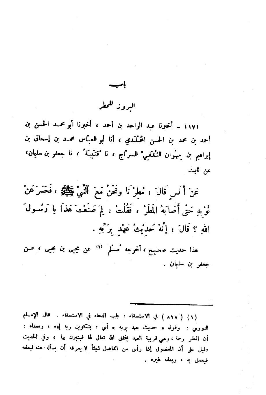 1171 - أَخْبَرَنَا عَبْدُ الْوَاحِدِ بْنُ أَحْمَدَ، أَخْبَرَنَا أَبُو مُحَمَّدٍ الْحَسَنُ بْنُ أَحْمَدَ بْنِ مُحَمَّدِ بْنِ الْحَسَنِ الْمَخْلَدِيُّ، أَنا أَبُو الْعَبَّاسِ مُحَمَّدُ بْنُ إِسْحَاقَ بْنِ إِبْرَاهِيمَ بْنِ مِهْرَانَ الثَّقَفِيُّ السَّرَّاجُ، نَا قُتَيْبَةُ، نَا جَعْفَرُ بْنُ سُلَيْمَانَ، عَنْ ثَابِتٍ، عَنْ أَنَسٍ، قَالَ: مُطِرْنَا وَنَحْنُ مَعَ النَّبِيِّ صَلَّى اللهُ عَلَيْهِ وَسَلَّمَ، فَحَسَرَ عَنْ ثَوْبِهِ حَتَّى أَصَابَهُ الْمَطَرُ، فَقُلْتُ: لِمَ صَنَعْتَ هَذَا يَا رَسُولَ اللَّهِ؟ قَالَ: «إِنَّهُ حَدِيثُ عَهْدٍ بِرَبِّهِ».