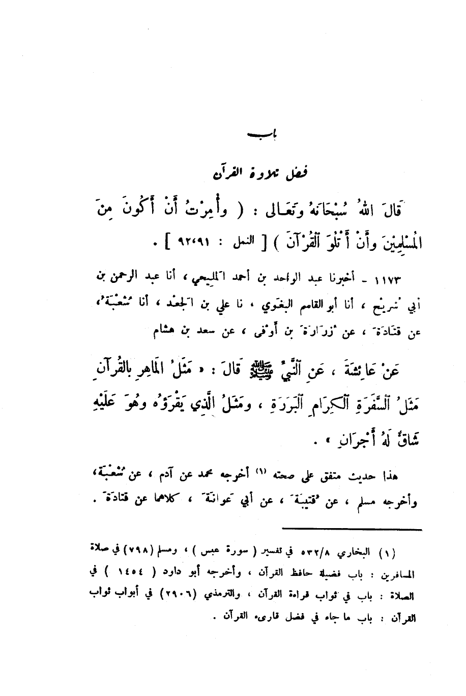 1173 - أَخْبَرَنَا عَبْدُ الْوَاحِدِ بْنُ أَحْمَدَ الْمَلِيحِيُّ، أَنا عَبْدُ الرَّحْمَنِ بْنُ أَبِي شُرَيْحٍ، أَنا أَبُو الْقَاسِمِ الْبَغَوِيُّ، نَا عَلِيُّ بْنُ الْجَعْدِ، أَنا شُعْبَةُ، عَنْ قَتَادَةَ، عَنْ زُرَارَةَ بْنِ أَوْفَى، عَنْ سَعْدِ بْنِ هِشَامٍ، عَنْ عَائِشَةَ، عَنِ النَّبِيِّ صَلَّى اللهُ عَلَيْهِ وَسَلَّمَ، قَالَ: «مَثَلُ الْمَاهِرِ بِالْقُرْآنِ مَثَلُ السَّفَرَةِ الْكِرَامِ الْبَرَرَةِ، وَمَثَلُ الَّذِي يَقْرَؤُهُ، وَهُوَ عَلَيْهِ شَاقٌّ لَهُ أَجْرَانِ».