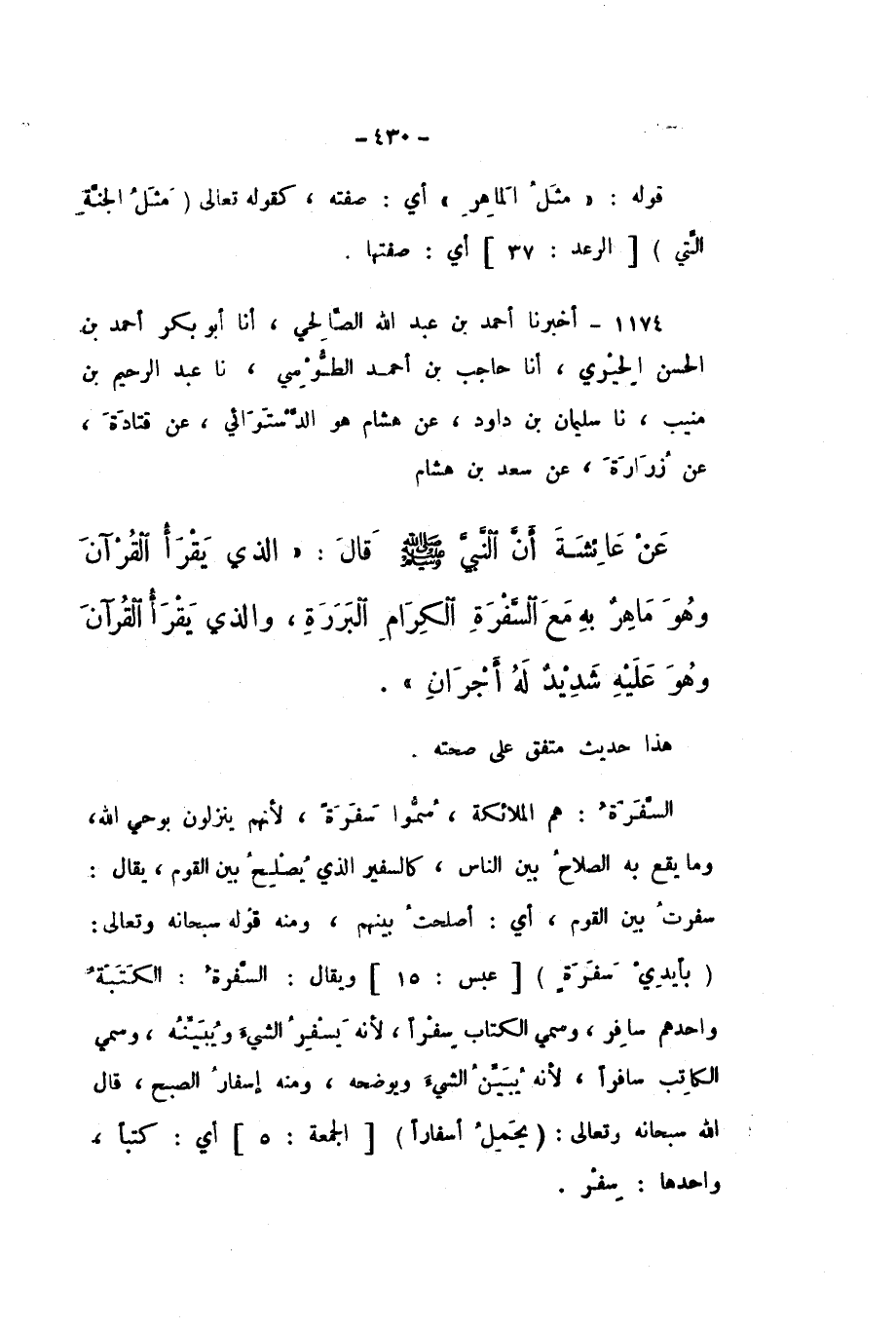 1175 - أَخْبَرَنَا أَحْمَدُ بْنُ عَبْدِ اللَّهِ الصَّالِحِيُّ، أَنا أَبُو بَكْرٍ أَحْمَدُ بْنُ الْحَسَنِ الْحِيرِيُّ، أَنا حَاجِبُ بْنُ أَحْمَدَ الطُّوسِيُّ، نَا عَبْدُ الرَّحِيمِ بْنُ مُنِيبٍ، نَا سُلَيْمَانُ بْنُ دَاوُدَ، عَنْ هِشَامٍ، هُوَ الدَّسْتُوَائِيُّ، عَنْ قَتَادَةَ، عَنْ زُرَارَةَ، عَنْ سَعْدِ بْنِ هِشَامٍ، عَنْ عَائِشَةَ، أَنّ النَّبِيَّ صَلَّى اللهُ عَلَيْهِ وَسَلَّمَ، قَالَ: «الَّذِي يَقْرَأُ الْقُرْآنَ وَهُوَ مَاهِرٌ بِهِ مَعَ السَّفَرَةِ الْكِرَامِ الْبَرَرَةِ، وَالَّذِي يَقْرَأُ الْقُرْآنَ وَهُوَ عَلَيْهِ شَدِيدٌ لَهُ أَجْرَانِ».