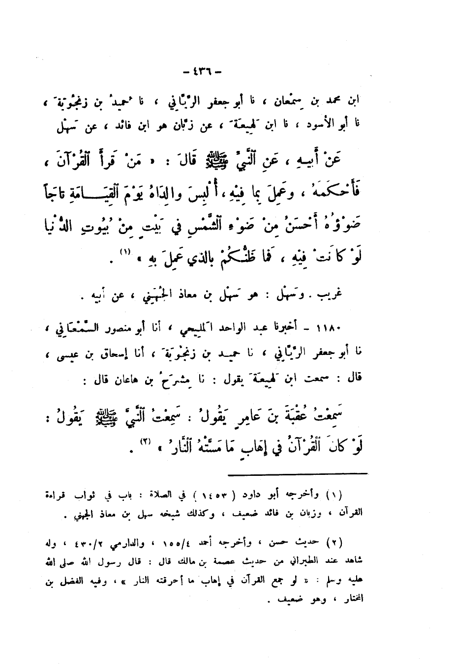 1180 - أَخْبَرَنَا عَبْدُ الْوَاحِدِ الْمَلِيحِيُّ، أَنا أَبُو مَنْصُورٍ السَّمْعَانِيُّ، نَا أَبُو جَعْفَرٍ الرَّيَّانِيُّ، نَا حُمَيْدُ بْنُ زَنْجُوَيْهِ، أَنا إِسْحَاقُ بْنُ عِيسَى، قَالَ: سَمِعْتُ ابْنَ لَهِيعَةَ، يَقُولُ: نَا مِشْرَحُ بْنُ هَاعَانَ، قَالَ: سَمِعْتُ عُقْبَةَ بْنَ عَامِرٍ، يَقُولُ: سَمِعْتُ النَّبِيَّ صَلَّى اللهُ عَلَيْهِ وَسَلَّمَ، يَقُولُ: «لَوْ كَانَ الْقُرْآنُ فِي إِهَابٍ مَا مَسَّتْهُ النَّارُ»