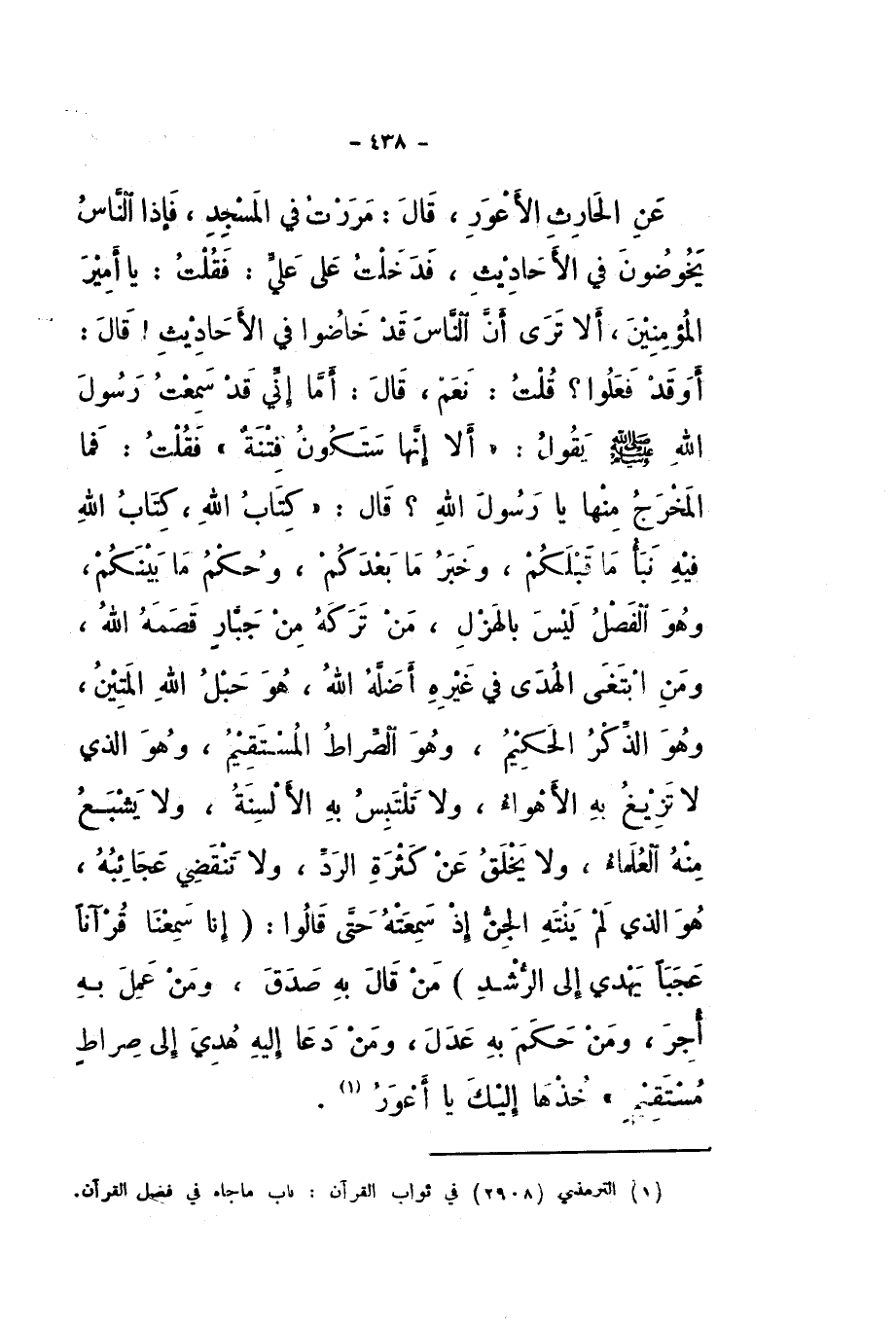 عَنِ الْحَارِثِ الأَعْوَرِ، قَالَ: مَرَرْتُ فِي الْمَسْجِدِ، فَإِذَا النَّاسُ يَخُوضُونَ فِي الأَحَادِيثِ، فَدَخَلْتُ عَلَى عَلِيٍّ، فَقُلْتُ: يَا أَمِيرَ الْمُؤْمِنِينَ، أَلا تَرَى أَنَّ النَّاسَ قَدْ خَاضُوا فِي الأَحَادِيثِ! قَالَ: أَوَ قَدْ فَعَلُوا؟ قُلْتُ: نَعَمْ، قَالَ: أَمَا إِنِّي قَدْ سَمِعْتُ رَسُولَ اللَّهِ صَلَّى اللهُ عَلَيْهِ وَسَلَّمَ، يَقُولُ: «أَلا إِنَّهَا سَتَكُونُ فِتْنَةٌ»، فَقُلْتُ: فَمَا الْمَخْرَجُ مِنْهَا يَا رَسُولَ اللَّهِ؟ قَالَ: " كِتَابُ اللَّهِ، كِتَابُ اللَّهِ فِيهِ نَبَأُ مَا قَبْلَكُمْ، وَخَبَرُ مَا بَعْدَكُمْ، وَحُكْمُ مَا بَيْنَكُمْ، وَهُوَ الْفَصْلُ لَيْسَ بِالْهَزْلِ، مَنْ تَرَكَهُ مِنْ جَبَّارٍ قَصَمَهُ اللَّهُ، وَمَنِ ابْتَغَى الْهُدَى فِي غَيْرِهِ أَضَلَّهُ اللَّهُ، هُوَ حَبْلُ اللَّهِ الْمَتِينُ، وَهُوَ الذِّكْرُ الْحَكِيمُ، وَهُوَ الصِّرَاطُ الْمُسْتَقِيمُ، وَهُوَ الَّذِي لَا تَزِيغُ بِهِ الأَهْوَاءُ، وَلا تَلْتَبِسُ بِهِ الأَلْسِنَةُ، وَلا يَشْبَعُ مِنْهُ الْعُلَمَاءُ، وَلا يخلق عَنْ كَثْرَةِ الرَّدِّ، وَلا تَنْقَضِي عَجَائِبُهُ، هُوَ الَّذِي لَمْ يَنْتَهِ الْجِنُّ إِذْ سَمِعَتْهُ حَتَّى، قَالُوا: {إِنَّا سَمِعْنَا قُرْءَانًا عَجَبًا {1} يَهْدِي إِلَى الرُّشْدِ} [الْجِنّ: 1 - 2]، مَنْ قَالَ بِهِ صَدَقَ، وَمَنْ عَمِلَ بِهِ أُجِرَ، وَمَنْ حَكَمَ بِهِ عَدَلَ، وَمَنْ دَعَا إِلَيْهِ هُدِيَ إِلَى صِرَاطٍ مُسْتَقِيمٍ ".