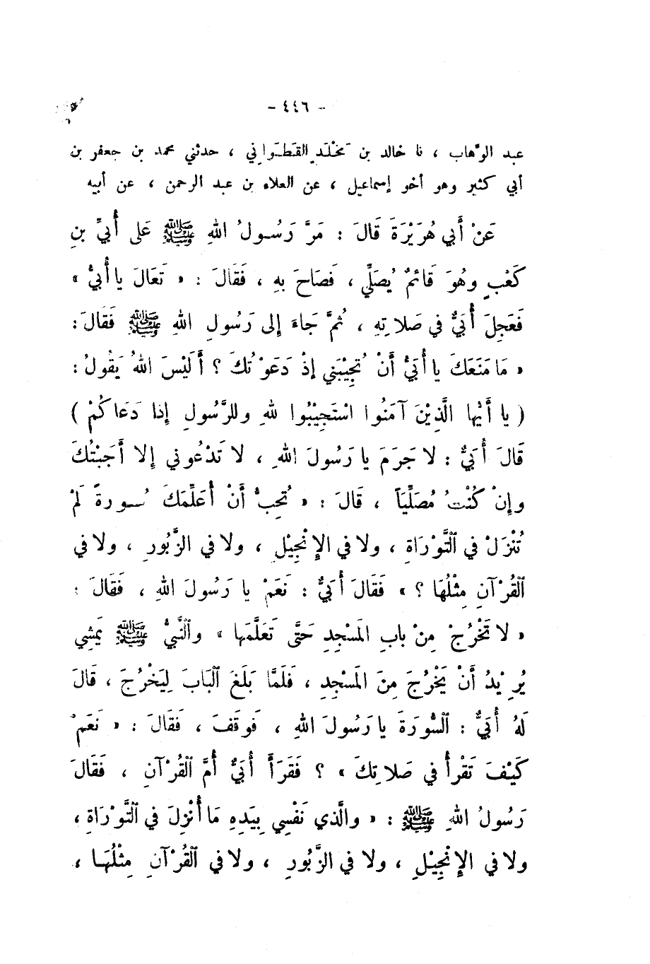 عَبْدِ الْوَهَّابِ، نَا خَالِدُ بْنُ مَخْلَدٍ الْقَطَوَانِيُّ، حَدَّثَنِي مُحَمَّدُ بْنُ جَعْفَرِ بْنِ أَبِي كَثِيرٍ، وَهُوَ أَخُو إِسْمَاعِيلَ، عَنِ الْعَلاءِ بْنِ عَبْدِ الرَّحْمَنِ، عَنْ أَبِيهِ، عَنْ أَبِي هُرَيْرَةَ، قَالَ: " مَرَّ رَسُولُ اللَّهِ صَلَّى اللهُ عَلَيْهِ وَسَلَّمَ عَلَى أُبَيِّ بْنِ كَعْبٍ، وَهُوَ قَائِمٌ يُصَلِّي، فَصَاحَ بِهِ، فَقَالَ: «تَعَالَ يَا أُبَيُّ، فَعَجِلَ أُبَيٌّ فِي صَلاتِهِ»، ثُمَّ جَاءَ إِلَى رَسُولِ اللَّهِ صَلَّى اللهُ عَلَيْهِ وَسَلَّمَ فَقَالَ: " مَا مَنَعَكَ يَا أُبَيُّ أَنْ تُجِيبَنِي إِذْ دَعَوْتُكَ؟ أَلَيْسَ اللَّهُ يَقُولُ: {يَأَيُّهَا الَّذِينَ آمَنُوا اسْتَجِيبُوا لِلَّهِ وَلِلرَّسُولِ إِذَا دَعَاكُمْ} [الْأَنْفَال: 24] "، قَالَ أُبَيٌّ: لَا جَرَمَ يَا رَسُولَ اللَّهِ، لَا تَدْعُونِي إِلا أَجَبْتُكَ وَإِنْ كُنْتُ مُصَلِّيًا، قَالَ: «تُحِبُّ أَنْ أُعَلِّمَكَ سُورَةً لَمْ تَنْزِلْ فِي التَّوْرَاةِ، وَلا فِي الإِنْجِيلِ، وَلا فِي الزَّبُورِ، وَلا فِي الْقُرْآنِ مِثْلُهَا؟» فَقَالَ أُبَيٌّ: نَعَمْ يَا رَسُولَ اللَّهِ، فَقَالَ: «لَا تَخْرُجْ مِنْ بَابِ الْمَسْجِدِ حَتَّى تَعْلَمَهَا» وَالنَّبِيُّ صَلَّى اللهُ عَلَيْهِ وَسَلَّمَ يَمْشِي يُرِيدُ أَنْ يَخْرُجَ مِنَ الْمَسْجِدِ، فَلَمَّا بَلَغَ الْبَابَ لِيَخْرُجَ، قَالَ لَهُ أُبَيٌّ: السُّورَةَ يَا رَسُولَ اللَّهِ، فَوَقَفَ، فَقَالَ: «نَعَمْ كَيْفَ تَقْرَأُ فِي صَلاتِكَ؟»، فَقَرَأَ أُبَيٌّ أُمَّ الْقُرْآنِ، فَقَالَ رَسُولُ اللَّهِ صَلَّى اللهُ عَلَيْهِ وَسَلَّمَ: «وَالَّذِي نَفْسِي بِيَدِهِ مَا أُنْزِلَ فِي التَّوْرَاةِ، وَلا فِي الإِنْجِيلِ، وَلا فِي الزَّبُورِ، وَلا فِي الْقُرْآنِ مِثْلُهَا،