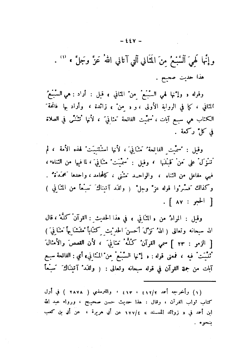 وَقَوْلُهُ «وَإِنَّهَا لَهِيَ السَّبْعُ مِنَ الْمَثَانِي» قِيلَ: أَرَادَ: هِيَ السَّبْعُ الْمَثَانِي، كَمَا فِي الرِّوَايَةِ الأُولَى، وَ «مِنْ» زَائِدَةٌ، وَأَرَادَ بِهَا فَاتِحَةَ الْكِتَابِ هِيَ سَبْعُ آيَاتٍ، سُمِّيَتِ الْفَاتِحَةُ مَثَانِيَ، لأَنَّهَا تُثَنَّى فِي الصَّلاةِ فِي كُلِّ رَكْعَةٍ.