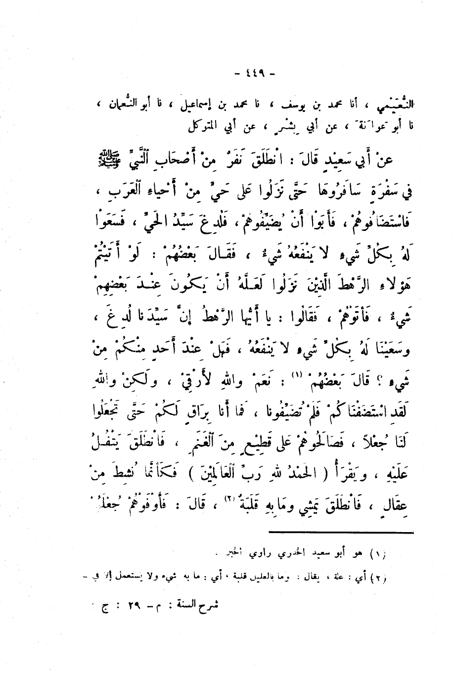 النُّعَيْمِيُّ، أَنا مُحَمَّدُ بْنُ يُوسُفَ، نَا مُحَمَّدُ بْنُ إِسْمَاعِيلَ، نَا أَبُو النُّعْمَانِ، نَا أَبُو عَوَانَةَ، عَنْ أَبِي بِشْرٍ، عَنْ أَبِي الْمُتَوَكِّلِ، عَنْ أَبِي سَعِيدٍ، قَالَ: انْطَلَقَ نَفَرٌ مِنْ أَصْحَابِ النَّبِيِّ صَلَّى اللهُ عَلَيْهِ وَسَلَّمَ فِي سَفْرَةٍ سَافَرُوهَا حَتَّى نَزَلُوا عَلَى حَيٍّ مِنْ أَحْيَاءِ الْعَرَبِ، فَاسْتَضَافُوهُمْ، فَأَبَوْا أَنْ يُضَيِّفُوهُمْ، فَلُدِغَ سَيِّدُ الْحَيِّ، فَسَعَوْا لَهُ بِكُلِّ شَيْءٍ لَا يَنْفَعُهُ شَيْءٌ، فَقَالَ بَعْضُهُمْ: لَوْ أَتَيْتُمْ هَؤُلاءِ الرَّهْطَ الَّذِينَ نَزَلُوا لَعَلَّهُ أَنْ يَكُونَ عِنْدَ بَعْضِهِمْ شَيْءٌ، فَأَتَوْهُمْ، فَقَالُوا: يَا أَيُّهَا الرَّهْطُ إِنَّ سَيِّدَنَا لُدِغَ، وَسَعَيْنَا لَهُ بِكُلِّ شَيْءٍ لَا يَنْفَعُهُ، فَهَلْ عِنْدَ أَحَدٍ مِنْكُمْ مِنْ شَيْءٍ؟ قَالَ بَعْضُهُمْ: نَعَمْ وَاللَّهِ لأَرْقِي، وَلَكِنْ وَاللَّهِ لَقَدِ اسْتَضَفْنَاكُمْ فَلَمْ تُضَيِّفُونَا، فَمَا أَنَا بِرَاقٍ لَكُمْ حَتَّى تَجْعَلُوا لَنَا جُعْلا، فَصَالَحُوهُمْ عَلَى قَطِيعٍ مِنَ الْغَنَمِ، فَانْطَلَقَ يَتْفُلُ عَلَيْهِ، وَيَقْرَأُ {الْحَمْدُ لِلَّهِ رَبِّ الْعَالَمِينَ} [الْفَاتِحَة: 2] فَكَأَنَّمَا نُشِطَ مِنْ عِقَالٍ، فَانْطَلَقَ يَمْشِي وَمَا بِهِ قَلَبَةٌ، قَالَ: فَأَوْفَوْهُمْ جُعْلَهُمُ