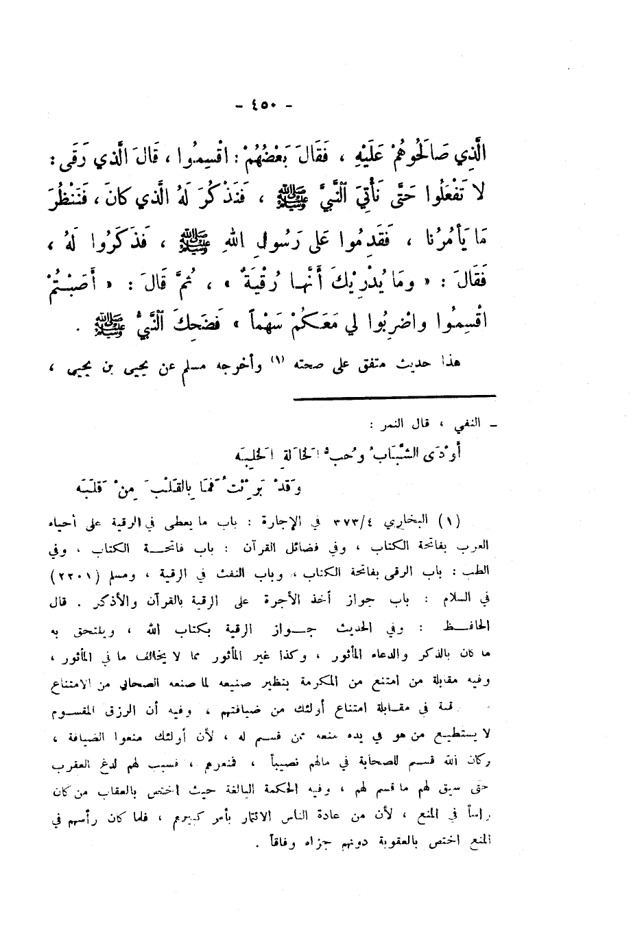الَّذِي صَالَحُوهُمْ عَلَيْهِ، فَقَالَ بَعْضُهُمُ: اقْسِمُوا، قَالَ الَّذِي رَقَى: لَا تَفْعَلُوا حَتَّى نَأْتِيَ النَّبِيَّ صَلَّى اللهُ عَلَيْهِ وَسَلَّمَ، فَنَذْكُرَ لَهُ الَّذِي كَانَ، فَنَنْظُرَ مَا يَأْمُرُنَا، فَقَدِمُوا عَلَى رَسُولِ اللَّهِ صَلَّى اللهُ عَلَيْهِ وَسَلَّمَ، فَذَكَرُوا لَهُ، فَقَالَ: «وَمَا يُدْرِيكَ أَنَّهَا رُقْيَةٌ»، ثُمَّ قَالَ: «أَصَبْتُمُ اقْسِمُوا، وَاضْرِبُوا لِي مَعَكُمْ سَهْمًا».