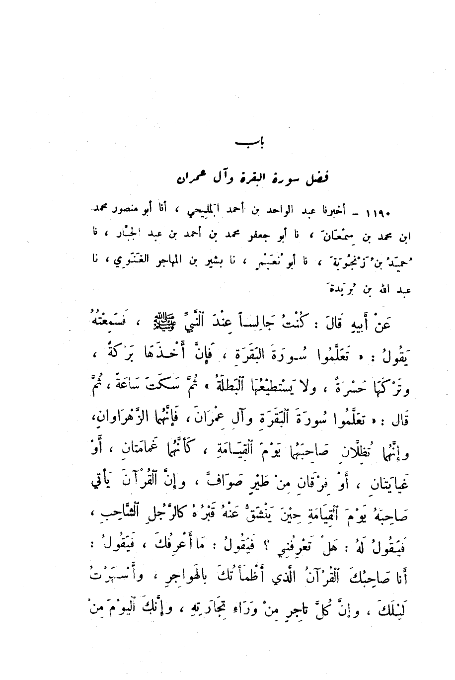 1190 - أَخْبَرَنَا عَبْدُ الْوَاحِدِ بْنُ أَحْمَدَ الْمَلِيحِيُّ، أَنا أَبُو مَنْصُورٍ مُحَمَّدُ بْنُ مُحَمَّدِ بْنِ سَمْعَانَ، نَا أَبُو جَعْفَرٍ مُحَمَّدُ بْنُ أَحْمَدَ بْنِ عَبْدِ الْجَبَّارِ، نَا حُمَيْدُ بْنُ زَنْجُوَيْهِ، نَا أَبُو نُعَيْمٍ، نَا بَشِيرُ بْنُ الْمُهَاجِرِ الْغَنَوِيُّ، نَا عَبْدُ اللَّهِ بْنُ بُرَيْدَةَ، عَنْ أَبِيهِ، قَالَ: كُنْتُ جَالِسًا عِنْدَ النَّبِيِّ صَلَّى اللهُ عَلَيْهِ وَسَلَّمَ، فَسَمِعْتُهُ، يَقُولُ: «تَعَلَّمُوا سُورَةَ الْبَقَرَةِ، فَإِنَّ أَخْذَهَا بَرَكَةٌ، وَتَرْكَهَا حَسْرَةٌ، وَلا يَسْتَطِيعُهَا الْبَطَلَةُ» ثُمَّ سَكَتَ سَاعَةً، ثُمَّ قَالَ: " تَعَلَّمُوا سُورَةَ الْبَقَرَةِ وَآلِ عِمْرَانَ، فَإِنَّهُمَا الزَّهْرَاوَانِ، وَإِنَّهُمَا تُظِلانِ صَاحِبَهُمَا يَوْمَ الْقِيَامَةِ، كَأَنَّهُمَا غَمَامَتَانِ، أَوْ غَيَايَتَانِ، أَوْ فِرْقَانِ مِنْ طَيْرٍ صَوَافَّ، وَإِنَّ الْقُرْآنَ يَأْتِي صَاحِبَهُ يَوْمَ الْقِيَامَةِ حِينَ يَنْشَقُّ عَنْهُ قَبْرُهُ كَالرَّجُلِ الشَّاحِبِ، فَيَقُولُ لَهُ: هَلْ تَعْرِفُنِي؟ فَيَقُولُ: مَا أَعْرِفُكَ، فَيَقُولُ: أَنَا صَاحِبُكَ الْقُرْآنُ الَّذِي أَظْمَأْتُكَ بِالْهَوَاجِرِ، وَأَسْهَرْتُ لَيْلَكَ، وَإِنَّ كُلَّ تَاجِرٍ مِنْ وَرَاءِ تِجَارَتِهِ، وَإِنَّكَ الْيَوْمَ مِنْ