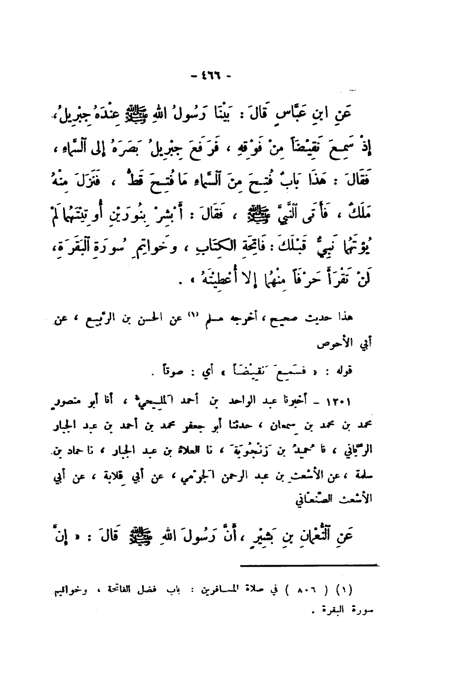 عَنِ ابْنِ عَبَّاسٍ، قَالَ: بَيْنَا رَسُولُ اللَّهِ صَلَّى اللهُ عَلَيْهِ وَسَلَّمَ عِنْدَهُ جِبْرِيلُ، إِذْ سَمِعَ نَقِيضًا مِنْ فَوْقِهِ، فَرَفَعَ جِبْرِيلُ بَصَرَهُ إِلَى السَّمَاءِ، فَقَالَ: هَذَا بَابٌ فُتِحَ مِنَ السَّمَاءِ مَا فُتِحَ قَطُّ، فَنَزَلَ مِنْهُ مَلَكٌ، فَأَتَى النَّبِيَّ صَلَّى اللهُ عَلَيْهِ وَسَلَّمَ، فَقَالَ: " أَبْشِرْ بِنُورَيْنِ أُوتِيتَهُمَا لَمْ يُؤْتَهُمَا نَبِيٌّ قَبْلَكَ: فَاتِحَةِ الْكِتَابِ، وَخَوَاتِمِ سُورَةِ الْبَقَرَةِ، لَنْ تَقْرَأَ حَرْفًا مِنْهُمَا إِلا أُعْطِيتَهُ ".