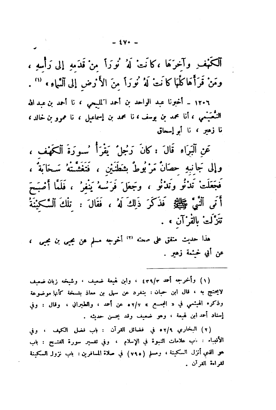 1206 - أَخْبَرَنَا عَبْدُ الْوَاحِدِ بْنُ أَحْمَدَ الْمَلِيحِيُّ، نَا أَحْمَدُ بْنُ عَبْدِ اللَّهِ النُّعَيْمِيُّ، أَنا مُحَمَّدُ بْنُ يُوسُفَ، نَا مُحَمَّدُ بْنُ إِسْمَاعِيلَ، نَا عَمْرُو بْنُ خَالِدٍ، نَا زُهَيْرٌ، نَا أَبُو إِسْحَاقَ، عَنِ الْبَرَاءِ، قَالَ: كَانَ رَجُلٌ يَقْرَأُ سُورَةَ الْكَهْفِ، وَإِلَى جَانِبِهِ حِصَانٌ مَرْبُوطٌ بِشَطَنَيْنِ، فَتَغَشَّتْهُ سَحَابَةٌ، فَجَعَلَتْ تَدْنُو وَتَدْنُو، وَجَعَلَ فَرَسُهُ يَنْفِرُ، فَلَمَّا أَصْبَحَ أَتَى النَّبِيَّ صَلَّى اللهُ عَلَيْهِ وَسَلَّمَ فَذَكَرَ ذَلِكَ لَهُ، فَقَالَ: «تِلْكَ السَّكِينَةُ تَنَزَّلَتْ بِالْقُرْآنِ».