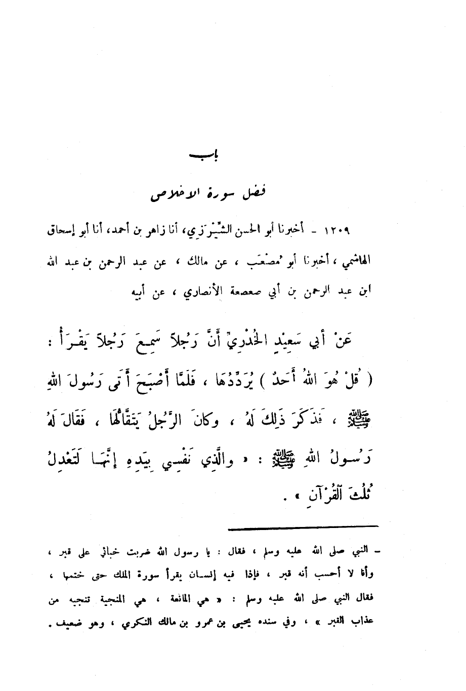 1209 - أَخْبَرَنَا أَبُو الْحَسَنِ الشِّيرَزِيُّ، أَنا زَاهِرُ بْنُ أَحْمَدَ، أَنا أَبُو إِسْحَاقَ الْهَاشِمِيُّ، أَخْبَرَنَا أَبُو مُصْعَبٍ، عَنْ مَالِكٍ، عَنْ عَبْدِ الرَّحْمَنِ بْنِ عَبْدِ اللَّهِ بْنِ عَبْدِ الرَّحْمَنِ بْنِ أَبِي صَعْصَعَةَ الأَنْصَارِيِّ، عَنْ أَبِيهِ، عَنْ أَبِي سَعِيدٍ الْخُدْرِيِّ: أَنَّ رَجُلا سَمِعَ رَجُلا يَقْرَأُ: قُلْ هُوَ اللَّهُ أَحَدٌ يُرَدِّدُهَا، فَلَمَّا أَصْبَحَ أَتَى رَسُولَ اللَّهِ صَلَّى اللهُ عَلَيْهِ وَسَلَّمَ، فَذَكَرَ ذَلِكَ لَهُ، وَكَانَ الرَّجُلُ يَتَقَالُّهَا، فَقَالَ لَهُ رَسُولُ اللَّهِ صَلَّى اللهُ عَلَيْهِ وَسَلَّمَ: «وَالَّذِي نَفْسِي بِيَدِهِ إِنَّهَا لَتَعْدِلُ ثُلُثَ الْقُرْآنِ».