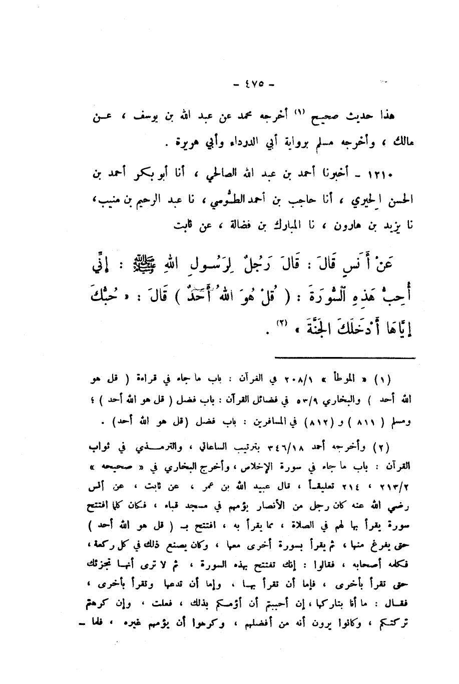 1210 - أَخْبَرَنَا أَحْمَدُ بْنُ عَبْدِ اللَّهِ الصَّالِحِيُّ، أَنا أَبُو بَكْرٍ أَحْمَدُ بْنُ الْحَسَنِ الْحِيرِيُّ، أَنا حَاجِبُ بْنُ أَحْمَدَ الطُّوسِيُّ، نَا عَبْدُ الرَّحِيمِ بْنُ مُنِيبٍ، نَا يَزِيدُ بْنُ هَارُونَ، نَا الْمُبَارَكُ بْنُ فَضَالَةَ، عَنْ ثَابِتٍ، عَنْ أَنَسٍ، قَالَ: قَالَ رَجُلٌ لِرَسُولِ اللَّهِ صَلَّى اللهُ عَلَيْهِ وَسَلَّمَ: إِنِّي أُحِبُّ هَذِهِ السُّورَةَ: قُلْ هُوَ اللَّهُ أَحَدٌ، قَالَ: «حُبُّكَ إِيَّاهَا أَدْخَلَكَ الْجَنَّةَ».