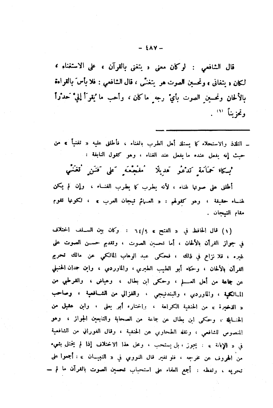 قَالَ الشَّافِعِيُّ: لَوْ كَانَ مَعْنَى «يَتَغَنَّى بِالْقُرْآنِ» عَلَى الاسْتِغْنَاءِ، لَكَانَ «يَتَغَانَى» وَتَحْسِينُ الصَّوْتِ هُوَ يَتَغَنَّى، قَالَ الشَّافِعِيُّ: فَلا بَأْسَ بِالْقِرَاءَةِ بِالأَلْحَانِ وَتَحْسِينِ الصَّوْتِ بِأَيِّ وَجْهٍ مَا كَانَ، وَأَحَبُّ مَا يُقْرَأُ إِلَيَّ حَدْرًا وَتَحْزِينًا.