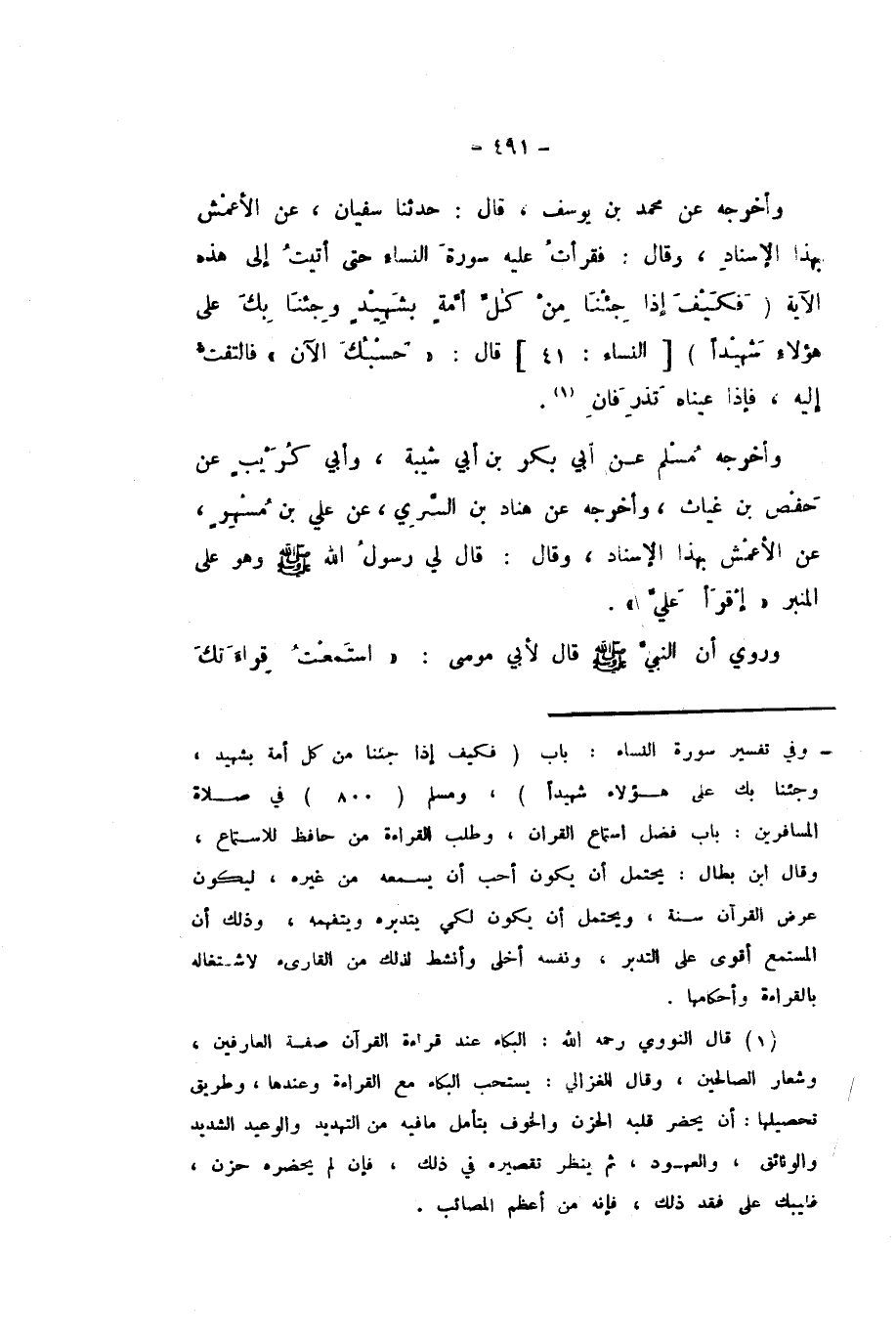 وَأَخْرَجَهُ عَن مُحَمَّد بْن يُوسُفَ، قَالَ: حَدَّثَنَا سُفْيَانُ، عَنِ الأَعْمَشِ، بِهَذَا الإِسْنَادِ، وَقَالَ: فَقَرَأْتُ عَلَيْهِ سُورَةَ النِّسَاءِ حَتَّى أَتَيْتُ إِلَى هَذِهِ الآيَةِ {فَكَيْفَ إِذَا جِئْنَا مِنْ كُلِّ أُمَّةٍ بِشَهِيدٍ وَجِئْنَا بِكَ عَلَى هَؤُلاءِ شَهِيدًا} [النِّسَاء: 41]، قَالَ: «حَسْبُكَ الآنَ» فَالْتَفَتُّ إِلَيْهِ، فَإِذَا عَيْنَاهُ تَذْرِفَانِ.
