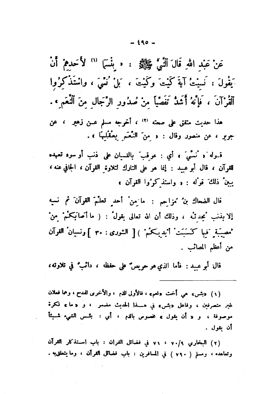 عَنْ عَبْدِ اللَّهِ، قَالَ النَّبِيُّ صَلَّى اللهُ عَلَيْهِ وَسَلَّمَ: " بِئْسَمَا لأَحَدِهِمْ أَنْ يَقُولَ: نَسِيتُ آيَةَ كَيْتَ وَكَيْتَ، بَلْ نُسِّيَ، وَاسْتَذْكِرُوا الْقُرْآنَ، فَإِنَّهُ أَشَدُّ تَفَصِّيًا مِنْ صُدُورِ الرِّجَالِ مِنَ النَّعَمِ ".