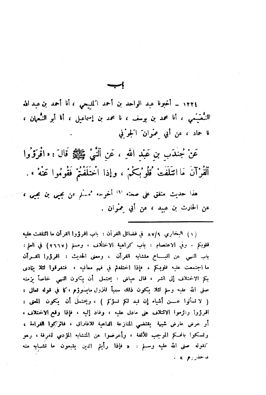 1224 - أَخْبَرَنَا عَبْدُ الْوَاحِدِ بْنُ أَحْمَدَ المَلِيحِيُّ، أَنا أَحْمَدُ بْنُ عَبْدِ اللَّهِ النُّعَيْمِيُّ، أَنا مُحَمَّدُ بْنُ يُوسُفَ، نَا مُحَمَّدُ بْنُ إِسْمَاعِيلَ، أَنا أَبُو النُّعْمَانِ، نَا حَمَّادٌ، عَنْ أَبِي عِمْرَانَ الْجَوْنِيِّ، عَنْ جُنْدبِ بْنِ عَبْدِ اللَّهِ، عَنِ النَّبِيِّ صَلَّى اللهُ عَلَيْهِ وَسَلَّمَ، قَالَ: «اقْرَءُوا الْقُرْآنَ مَا ائْتَلَفَتْ قُلُوبُكُمْ، وَإِذَا اخْتَلَفْتُمْ فَقُومُوا عَنْهُ».