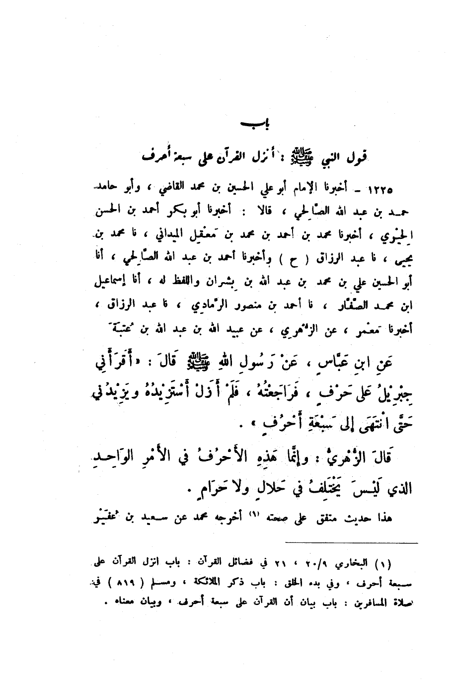 ح وَأَخْبَرَنَا أَحْمَدُ بْنُ عَبْدِ اللَّهِ الصَّالِحِيُّ، أَنا أَبُو الْحُسَيْنِ عَلِيُّ بْنُ مُحَمَّدِ بْنِ عَبْدِ اللَّهِ بْنِ بِشْرَانَ، وَاللَّفْظُ لَهُ، أَنا إِسْمَاعِيلُ بْنُ مُحَمَّدٍ الصَّفَّارُ، نَا أَحْمَدُ بْنُ مَنْصُورٍ الرَّمَادِيُّ، نَا عَبْدُ الرَّزَّاقِ، أَخْبَرَنَا مَعْمَرٌ، عَنِ الزُّهْرِيِّ، عَنْ عُبَيْدِ اللَّهِ بْنِ عَبْدِ اللَّهِ بْنِ عُتْبَةَ، عَنِ ابْنِ عَبَّاسٍ، عَنْ رَسُولِ اللَّهِ صَلَّى اللهُ عَلَيْهِ وَسَلَّمَ، قَالَ: «أَقْرَأَنِي جِبْرِيلُ عَلَى حَرْفٍ، فَرَاجَعْتُهُ، فَلَمْ أَزَلْ أَسْتَزِيدُهُ وَيَزِيدُنِي حَتَّى انْتَهَى إِلَى سَبْعَةِ أَحْرُفٍ».