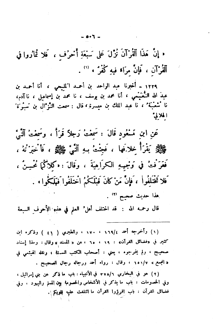 إِنَّ هَذَا الْقُرْآنَ نُزِّلَ عَلَى سَبْعَةِ أَحْرُفٍ، فَلا تُمَارُوا فِي الْقُرْآنِ، فَإِنَّ مِرَاءً فِيهِ كُفْرٌ»