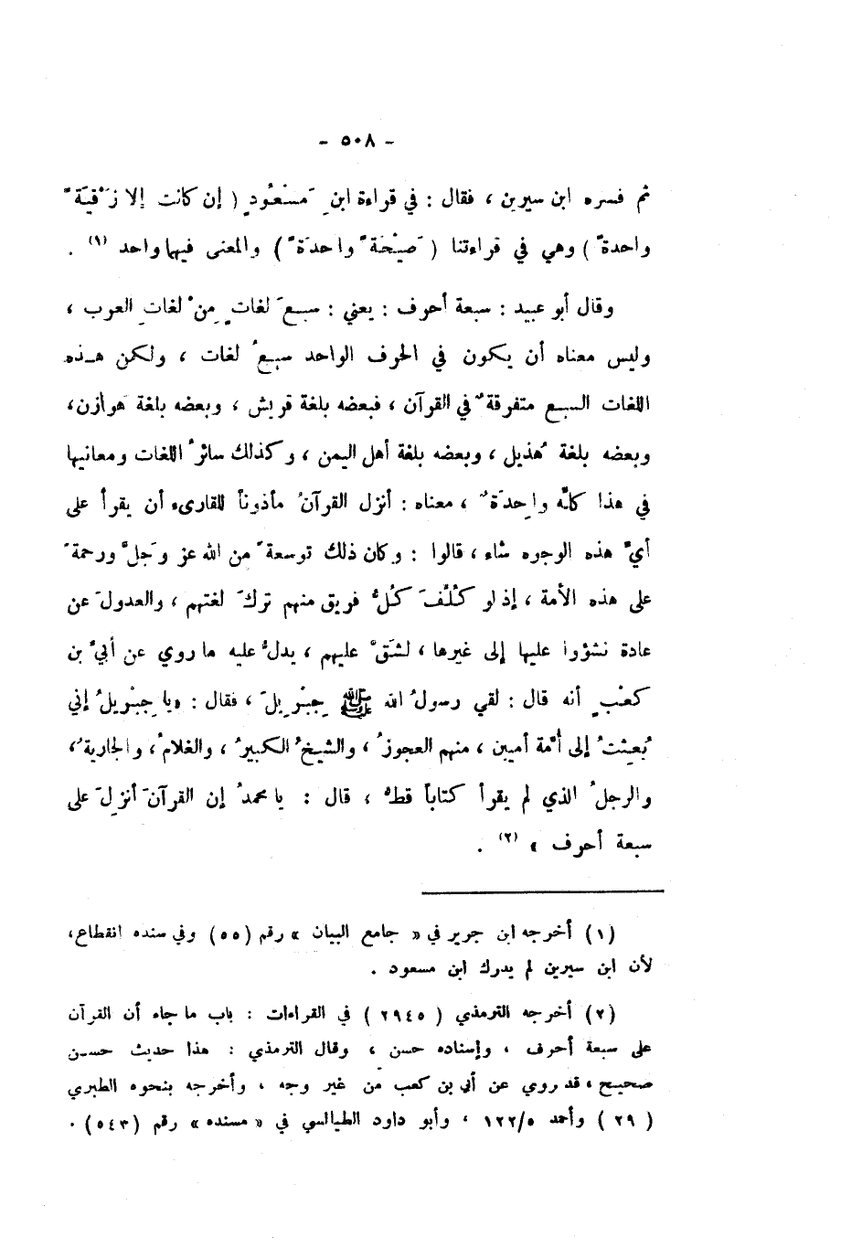 وَقَالَ أَبُو عُبَيْدٍ: سَبْعَةِ أَحْرُفٍ: يَعْنِي: سَبْعَ لُغَاتٍ مِنْ لُغَاتِ الْعَرَبِ، وَلَيْسَ مَعْنَاهُ أَنْ يَكُونَ فِي الْحَرْفِ الْوَاحِدِ سَبْعُ لُغَاتٍ، وَلَكِنَّ هَذِهِ اللُّغَاتِ السَّبْعَ مُتَفَرِّقَةٌ فِي الْقُرْآنِ، فَبَعْضُهُ بِلُغَةِ قُرَيْشٍ، وَبَعْضُهُ بِلُغَةِ هَوَازِنَ، وَبَعْضُهُ بِلُغَةِ هُذَيْلٍ، وَبَعْضُهُ بِلُغَةِ أَهْلِ الْيَمَنِ، وَكَذَلِكَ سَائِرُ اللُّغَاتِ، وَمَعَانِيهَا فِي هَذَا كُلِّهِ وَاحِدَةٌ، مَعْنَاهُ: أُنْزِلَ الْقُرْآنُ مَأْذُونًا لِلْقَارِئِ أَنْ يَقْرَأَ عَلَى أَيِّ هَذِهِ الْوُجُوهِ شَاءَ، قَالُوا: وَكَانَ ذَلِكَ تَوْسِعَةً مِنَ اللَّهِ عَزَّ وَجَلَّ، وَرَحْمَةً عَلَى هَذِهِ الأُمَّةِ، إِذْ لَوْ كُلِّفَ كُلُّ فَرِيقٍ مِنْهُمْ تَرْكَ لُغَتِهِمْ، وَالْعُدُولَ عَنْ عَادَةٍ نَشَئُوا عَلَيْهَا إِلَى غَيْرِهَا، لَشَقَّ عَلَيْهِمْ، يَدُلُّ عَلَيْهِ مَا رُوِيَ عَنْ أُبَيِّ بْنِ كَعْبٍ، أَنَّهُ قَالَ: لَقِيَ رَسُولُ اللَّهِ صَلَّى اللهُ عَلَيْهِ وَسَلَّمَ جِبْرِيلَ، فَقَالَ: " يَا جِبْرِيلُ، إِنِّي بُعِثْتُ إِلَى أُمَّةٍ أُمِّيِّينَ، مِنْهُمُ الْعَجُوزُ، وَالشَّيْخُ الْكَبِيرُ، وَالْغُلامُ، وَالْجَارِيَةُ، وَالرَّجُلُ الَّذِي لَمْ يَقْرَأْ كِتَابًا قَطُّ، قَالَ: يَا مُحَمَّدُ، إِنَّ الْقُرْآنَ أُنْزِلَ عَلَى سَبْعَةِ أَحْرُفٍ «.