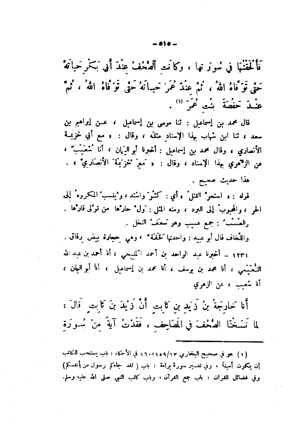 فَأَلْحَقْتُهَا فِي سُورَتِهَا، وَكَانَتِ الصُّحُفُ عِنْدَ أَبِي بَكْرٍ حَيَاتَهُ حَتَّى تَوَفَّاهُ اللَّهُ، ثُمَّ عِنْدَ عُمَرَ حَيَاتَهُ حَتَّى تَوَفَّاهُ اللَّهُ، ثُمَّ عِنْدَ حَفْصَةَ بِنْتِ عُمَرَ ".
