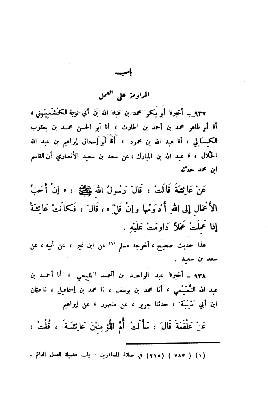 937 - أَخْبَرَنَا أَبُو بَكْرٍ مُحَمَّدُ بْنُ عَبْدِ اللَّهِ بْنِ أَبِي تَوْبَةَ الْكُشْمِيهَنِيُّ، أَنا أَبُو طَاهِرٍ مُحَمَّدُ بْنُ أَحْمَدَ بْنِ الْحَارِثِ، أَنا أَبُو الْحَسَنِ مُحَمَّدُ بْنُ يَعْقُوبَ الْكِسَائِيُّ، أَنا عَبْدُ اللَّهِ بْنُ مَحْمُودٍ، أَنا أَبُو إِسْحَاقَ إِبْرَاهِيمُ بْنُ عَبْدِ اللَّهِ الْخَلالُ، نَا عَبْدُ اللَّهِ بْنُ الْمُبَارَكِ، عَنْ سَعْدِ بْنِ سَعِيدٍ الأَنْصَارِيِّ، أَنَّ الْقَاسِمَ بْنَ مُحَمَّدٍ، حَدَّثَهُ عَنْ عَائِشَةَ، قَالَتْ: قَالَ رَسُولُ اللَّهِ صَلَّى اللهُ عَلَيْهِ وَسَلَّمَ: «إِنَّ أَحَبَّ الأَعْمَالِ إِلَى اللَّهِ أَدْوَمُهَا وَإِنْ قَلَّ»، قَالَ: فَكَانَتْ عَائِشَةُ إِذَا عَمِلَتْ عَمَلا دَاوَمَتْ عَلَيْهِ.