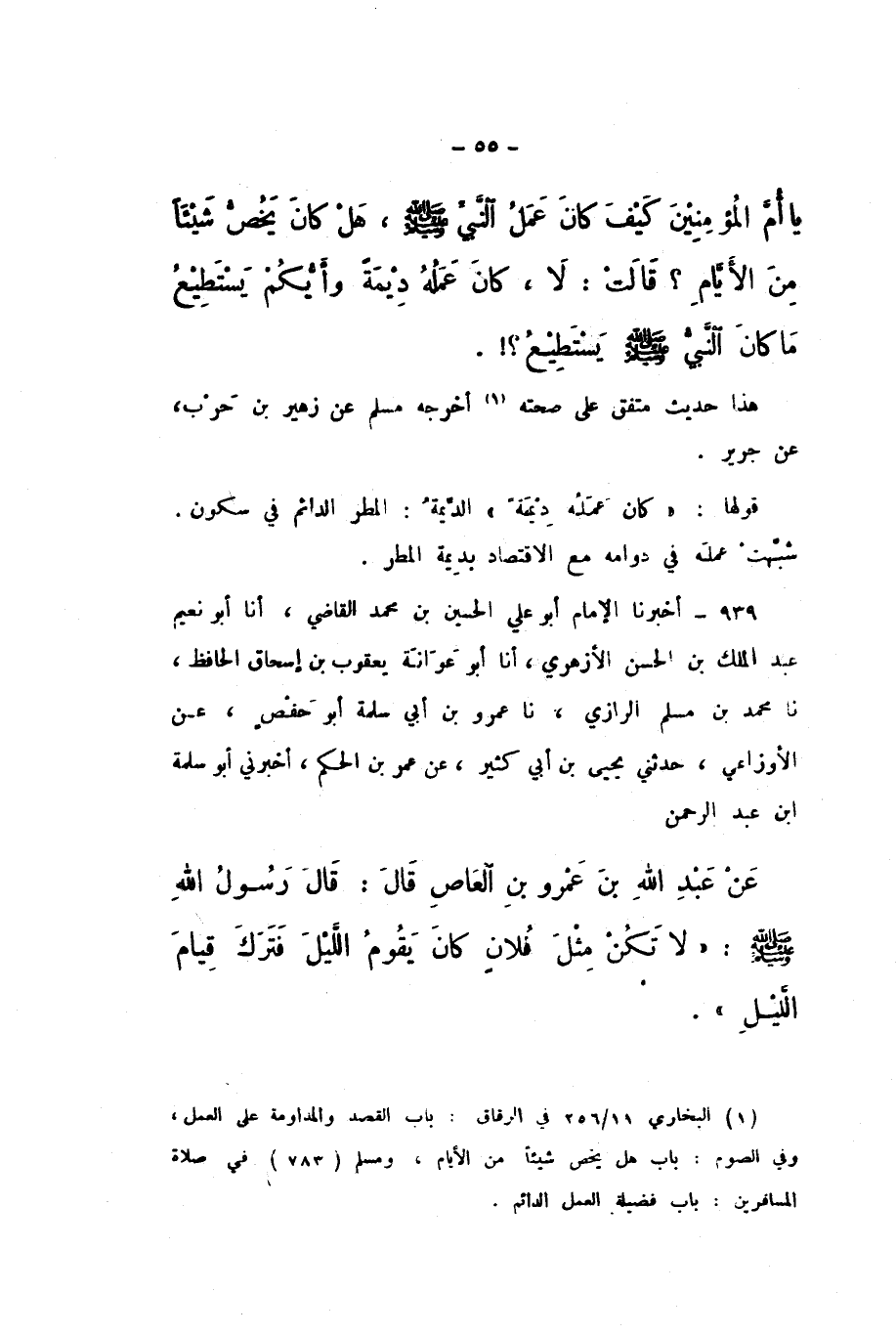939 - أَخْبَرَنَا الإِمَامُ أَبُو عَلِيٍّ الْحُسَيْنُ بْنُ مُحَمَّدٍ الْقَاضِي، أَنا أَبُو نُعَيْمٍ عَبْدُ الْمَلِكِ بْنُ الْحَسَنِ الأَزْهَرِيُّ، أَنا أَبُو عَوَانَةَ يَعْقُوبُ بْنُ إِسْحَاقَ الْحَافِظُ، نَا مُحَمَّدُ بْنُ مُسْلِمٍ الرَّازِيُّ، نَا عَمْرُو بْنُ أَبِي سَلَمَةَ أَبُو حَفْصٍ، عَنِ الأَوْزَاعِيِّ، حَدَّثَنِي يَحْيَى بْنُ أَبِي كَثِيرٍ، عَنْ عُمَرَ بْنِ الْحَكَمِ، أَخْبَرَنِي أَبُو سَلَمَةَ بْنُ عَبْدِ الرَّحْمَنِ، عَنْ عَبْدِ اللَّهِ بْنِ عَمْرِو بْنِ الْعَاصِ، قَالَ: قَالَ رَسُولُ اللَّهِ صَلَّى اللهُ عَلَيْهِ وَسَلَّمَ: «لَا تَكُنْ مِثْلَ فُلانٍ كَانَ يَقُومُ اللَّيْلَ فَتَرَكَ قِيَامَ اللَّيْلِ».
