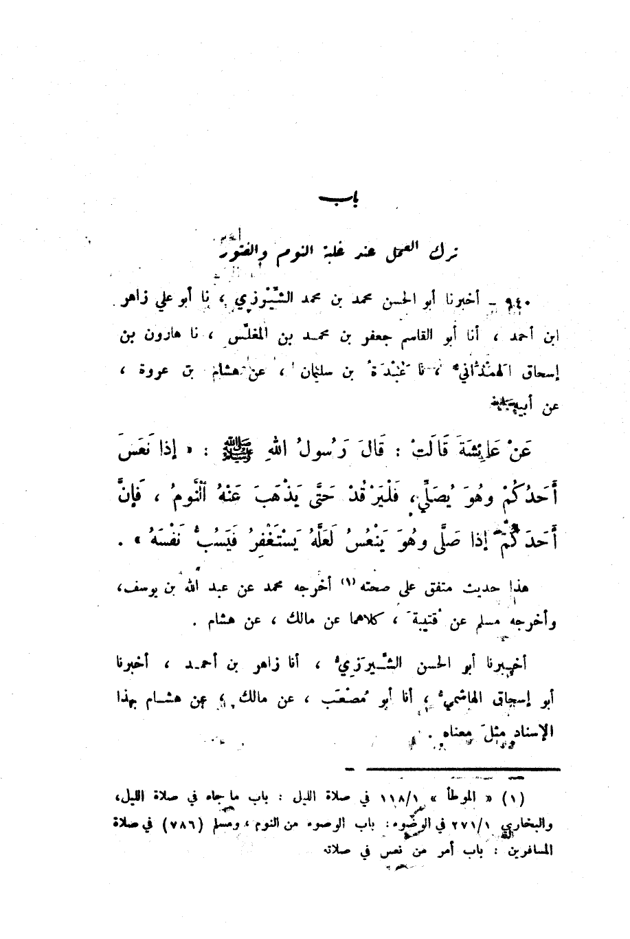 940 - أَخْبَرَنَا أَبُو الْحَسَنِ مُحَمَّدُ بْنُ مُحَمَّدٍ الشِّيرَزِيُّ، نَا أَبُو عَلِيٍّ زَاهِرُ بْنُ أَحْمَدَ، أَنا أَبُو الْقَاسِمِ جَعْفَرُ بْنُ مُحَمَّدِ بْنِ الْمُغَلِّسِ، نَا هَارُونُ بْنُ إِسْحَاقَ الْهَمْدَانِيُّ، نَا عَبْدَةُ بْنُ سُلَيْمَانَ، عَنْ هِشَامِ بْنِ عُرْوَةَ، عَنْ أَبِيهِ، عَنْ عَائِشَةَ، قَالَتْ: قَالَ رَسُولُ اللَّهِ صَلَّى اللهُ عَلَيْهِ وَسَلَّمَ: «إِذَا نَعَسَ أَحَدُكُمْ وَهُوَ يُصَلِّي، فَلْيَرْقُدْ حَتَّى يَذْهَبَ عَنْهُ النَّوْمُ، فَإِنَّ أَحَدَكُمْ إِذَا صَلَّى وَهُوَ يَنْعَسُ لَعَلَّهُ يَسْتَغْفِرُ فَيَسُبُّ نَفْسَهُ».