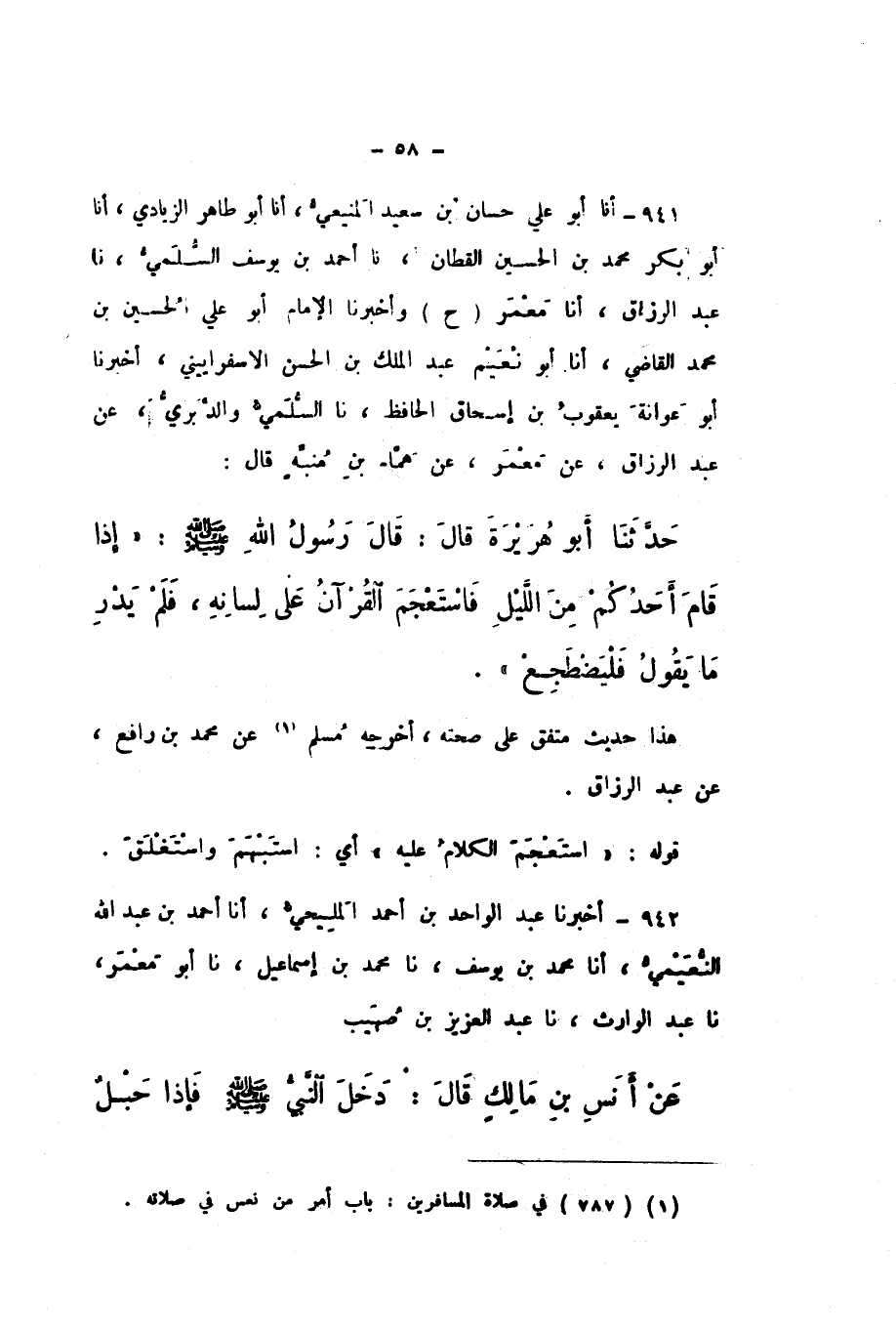 ح وَأَخْبَرَنَا الإِمَامُ أَبُو عَلِيٍّ الْحُسَيْنُ بْنُ مُحَمَّدٍ الْقَاضِي، أَنا أَبُو نُعَيْمٍ عَبْدُ الْمَلِكِ بْنُ الْحَسَنِ الإِسْفَرَايِينِيُّ، أَخْبَرَنَا أَبُو عَوَانَةَ يَعْقُوبُ بْنُ إِسْحَاقَ الْحَافِظُ، نَا السُّلَمِيُّ، وَالدَّبَرِيُّ، عَنْ عَبْدِ الرَّزَّاقِ، عَنْ مَعْمَرٍ، عَنْ هَمَّامِ بْنِ مُنَبِّهٍ، قَالَ: حَدَّثَنَا أَبُو هُرَيْرَةَ، قَالَ: قَالَ رَسُولُ اللَّهِ صَلَّى اللهُ عَلَيْهِ وَسَلَّمَ: «إِذَا قَامَ أَحَدُكُمْ مِنَ اللَّيْلِ فَاسْتَعْجَمَ الْقُرْآنُ عَلَى لِسَانِهِ، فَلَمْ يَدْرِ مَا يَقُولُ فَلْيَضْطَجِعْ».
