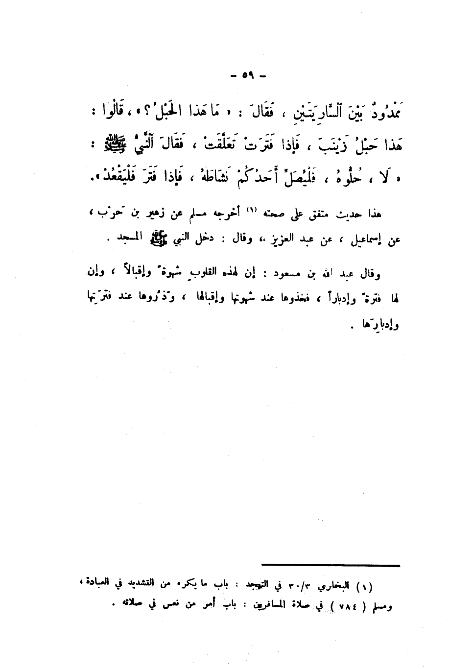 مَمْدُودٌ بَيْنَ السَّارِيَتَيْنِ»، فَقَالَ: «مَا هَذَا الْحَبْلُ؟»، قَالُوا: هَذَا حَبْلُ زَيْنَبَ، فَإِذَا فَتَرَتْ تَعَلَّقَتْ، فَقَالَ النَّبِيُّ صَلَّى اللهُ عَلَيْهِ وَسَلَّمَ: «لَا، حُلُّوهُ، فَلْيُصَلِّ أَحَدُكُمْ نَشَاطَهُ، فَإِذَا فَتَرَ فَلْيَقْعُدْ».
