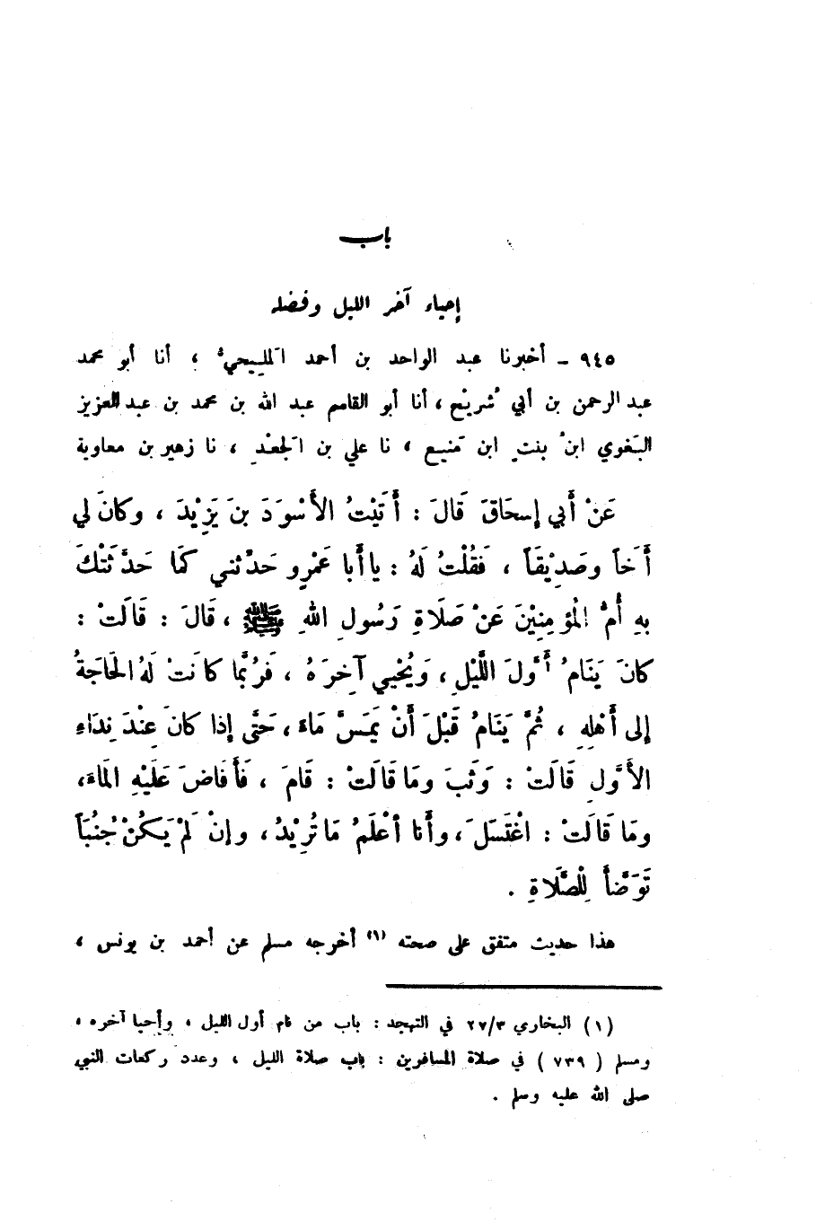 945 - أَخْبَرَنَا عَبْدُ الْوَاحِدِ بْنُ أَحْمَدَ الْمَلِيحِيُّ، أَنا أَبُو مُحَمَّدٍ عَبْدُ الرَّحْمَنِ بْنُ أَبِي شُرَيْحٍ، أَنا أَبُو الْقَاسِمِ عَبْدُ اللَّهِ بْنُ مُحَمَّدِ بْنِ عَبْدِ الْعَزِيزِ الْبَغَوِيُّ ابْنُ بِنْتِ ابْنِ مَنِيعٍ، نَا عَلِيُّ بْنُ الْجَعْدِ، نَا زُهَيْرُ بْنُ مُعَاوِيَةَ، عَنْ أَبِي إِسْحَاقَ، قَالَ: أَتَيْتُ الأَسْوَدَ بْنَ يَزِيدَ، وَكَانَ لِي أَخًا وَصَدِيقًا، فَقُلْتُ لَهُ: يَا أَبَا عَمْرٍو حَدِّثْنِي كَمَا حَدَّثَتْكَ بِهِ أُمُّ الْمُؤْمِنِينَ عَنْ صَلاةِ رَسُولِ اللَّهِ صَلَّى اللهُ عَلَيْهِ وَسَلَّمَ، قَالَ: قَالَتْ: " كَانَ يَنَامُ أَوَّلَ اللَّيْلِ، وَيُحْيِي آخِرَهُ، فَرُبَّمَا كَانَتْ لَهُ الْحَاجَةُ إِلَى أَهْلِهِ، ثُمَّ يَنَامُ قَبْلَ أَنْ يَمَسَّ مَاءً، حَتَّى إِذَا كَانَ عِنْدَ النِّدَاءِ الأَوَّلِ، قَالَتْ: وَثَبَ، وَمَا قَالَتْ: قَامَ، فَأَفَاضَ عَلَيْهِ الْمَاءَ، وَمَا قَالَتِ: اغْتَسَلَ، وَأَنَا أَعْلَمُ مَا تُرِيدُ، وَإِنْ لَمْ يَكُنْ جُنُبًا تَوَضَّأَ لِلصَّلاةِ ".