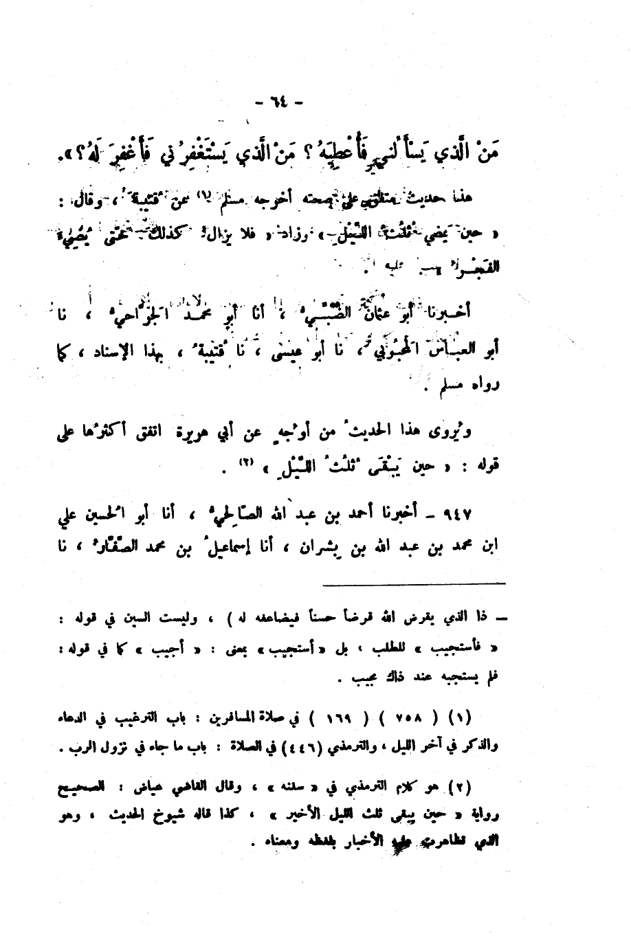 مَنِ الَّذِي يَسْأَلُنِي فَأُعْطِيَهُ؟ مَنِ الَّذِي يَسْتَغْفِرُنِي فَأَغْفِرَ لَهُ؟ ".