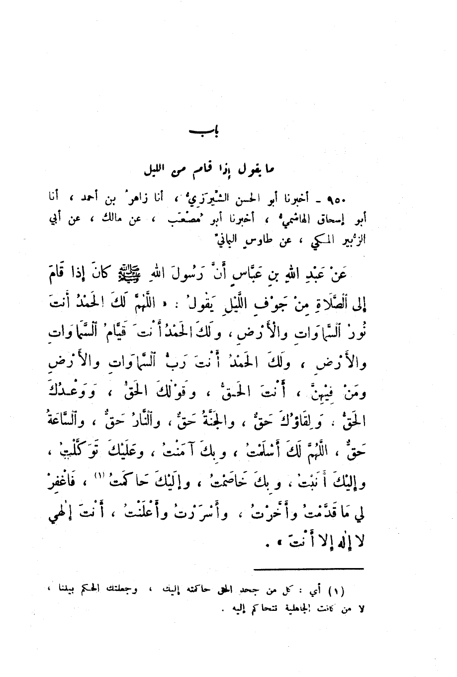950 - أَخْبَرَنَا أَبُو الْحَسَنِ الشِّيرَزِيُّ، أَنا زَاهِرُ بْنُ أَحْمَدَ، أَنا أَبُو إِسْحَاقَ الْهَاشِمِيُّ، أَخْبَرَنَا أَبُو مُصْعَبٍ، عَنْ مَالِكٍ، عَنْ أَبِي الزُّبَيْرِ الْمَكِّيِّ، عَنْ طَاوُسٍ الْيَمَانِيِّ، عَنْ عَبْدِ اللَّهِ بْنِ عَبَّاسٍ، أَنَّ رَسُولَ اللَّهِ صَلَّى اللهُ عَلَيْهِ وَسَلَّمَ كَانَ إِذَا قَامَ إِلَى الصَّلاةِ مِنْ جَوْفِ اللَّيْلِ، يَقُولُ: «اللَّهُمَّ لَكَ الْحَمْدُ أَنْتَ نُورُ السَّمَوَاتِ وَالأَرْضِ، وَلَكَ الْحَمْدُ أَنْتَ قَيَّامُ السَّمَوَاتِ وَالأَرْضِ، وَلَكَ الْحَمْدُ أَنْتَ رَبُّ السَّمَوَاتِ وَالأَرْضِ وَمَنْ فِيهِنَّ، أَنْتَ الْحَقُّ، وَقَوْلُكَ الْحَقُّ، وَوَعْدُكَ الْحَقُّ، وَلِقَاؤُكَ حَقٌّ، وَالْجَنَّةُ حَقٌّ، وَالنَّارُ حَقٌّ، وَالسَّاعَةُ حَقٌّ، اللَّهُمَّ لَكَ أَسْلَمْتُ، وَبِكَ آمَنْتُ، وَعَلَيْكَ تَوَكَّلْتُ، وَإِلَيْكَ أَنَبْتُ، وَبِكَ خَاصَمْتُ، وَإِلَيْكَ حَاكَمْتُ، فَاغْفِرْ لِي مَا قَدَّمْتُ وَأَخَّرْتُ، وَأَسْرَرْتُ وَأَعْلَنْتُ، أَنْتَ إِلَهِي لَا إِلَهَ إِلا أَنْتَ».