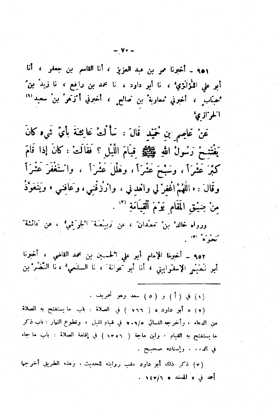 951 - أَخْبَرَنَا عُمَرُ بْنُ عَبْدِ الْعَزِيزِ، أَنا الْقَاسِمُ بْنُ جَعْفَرٍ، أَنا أَبُو عَلِيٍّ اللُّؤْلُئِيُّ، نَا أَبُو دَاوُدَ، نَا مُحَمَّدُ بْنُ رَافِعٍ، نَا زَيْدُ بْنُ حُبَابٍ، أَخْبَرَنِي مُعَاوِيَةُ بْنُ صَالِحِ، أَخْبَرَنِي أَزْهَرُ بْنُ سَعِيدٍ الْحَرَازِيُّ، عَنْ عَاصِمِ بْنِ حُمَيْدٍ، قَالَ: سَأَلْتُ عَائِشَةَ بِأَيِّ شَيْءٍ كَانَ يَفْتَتِحُ رَسُولُ اللَّهِ صَلَّى اللهُ عَلَيْهِ وَسَلَّمَ قِيَامَ اللَّيْلِ؟ فَقَالَتْ: " كَانَ إِذَا قَامَ كَبَّرَ عَشْرًا، وَسَبَّحَ عَشْرًا، وَهَلَّلَ عَشْرًا، وَاسْتَغْفَرَ عَشْرًا، وَقَالَ: اللَّهُمَّ اغْفِرْ لِي وَاهْدِنِي، وَارْزُقْنِي، وَعَافِنِي، وَيَتَعَوَّذُ مِنْ ضِيقِ الْمَقَامِ يَوْمَ الْقِيَامَةِ ".