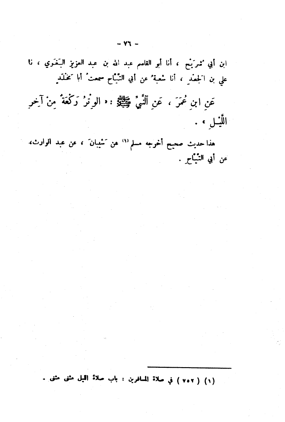بْنُ أَبِي شُرَيْحٍ، أَنا أَبُو الْقَاسِمِ عَبْدُ اللَّهِ بْنُ عَبْدِ الْعَزِيزِ الْبَغَوِيُّ، نَا عَلِيُّ بْنُ الْجَعْدِ، أَنا شُعْبَةُ، عَنْ أَبِي التَّيَّاحِ سَمِعْتُ أَبَا مَخْلَدٍ، عَنِ ابْنِ عُمَرَ، عَنِ النَّبِيِّ صَلَّى اللهُ عَلَيْهِ وَسَلَّمَ: «الْوِتْرُ رَكْعَةٌ مِنْ آخِرِ اللَّيْلِ».
