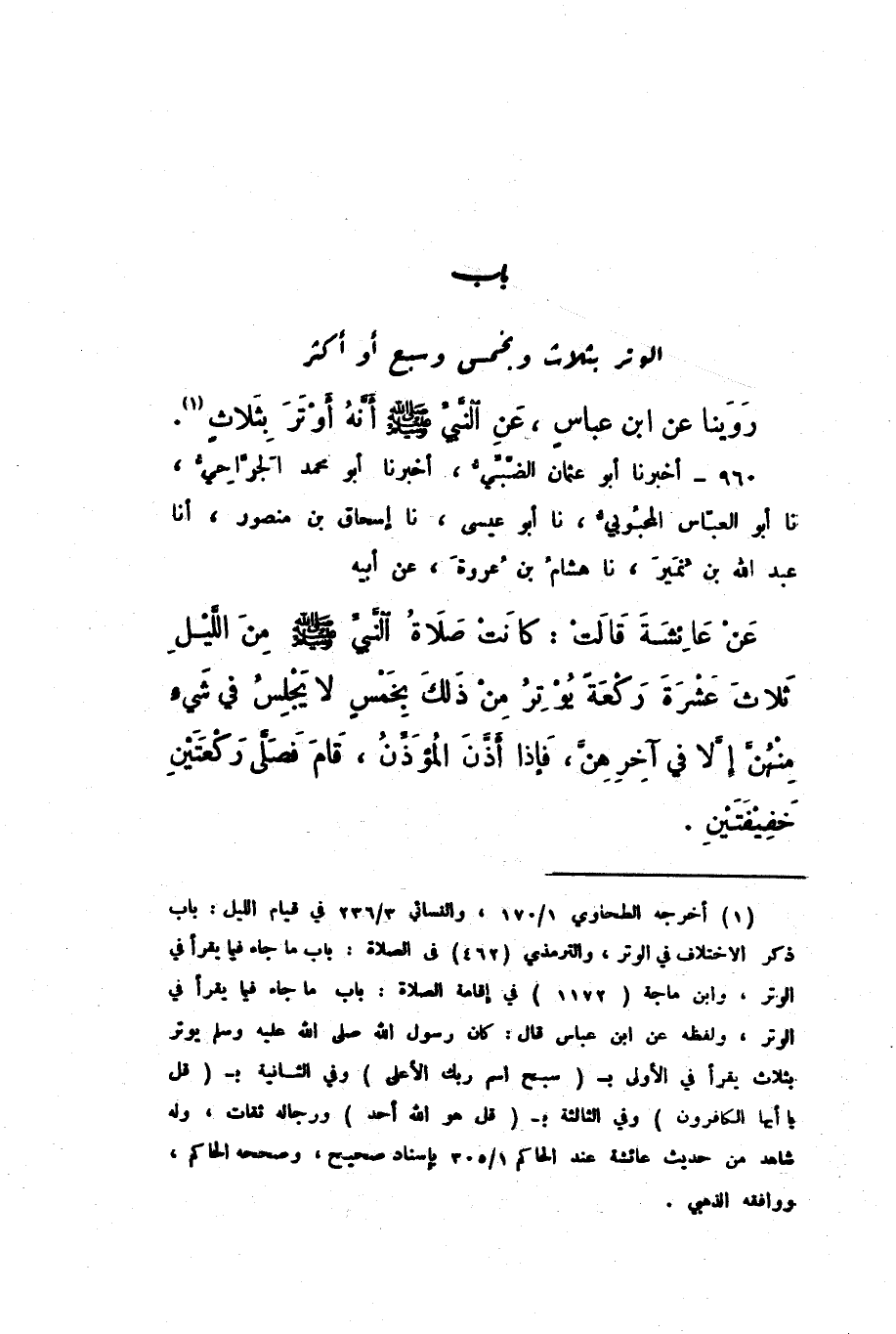 960 - أَخْبَرَنَا أَبُو عُثْمَانَ الضَّبِّيُّ، أَخْبَرَنَا أَبُو مُحَمَّدٍ الْجَرَّاحِيُّ، نَا أَبُو الْعَبَّاسِ الْمَحْبُوبِيُّ، نَا أَبُو عِيسَى، نَا إِسْحَاقُ بْنُ مَنْصُورٍ، أَنا عَبْدُ اللَّهِ بْنُ نُمَيْرٍ، نَا هِشَامُ بْنُ عُرْوَةَ، عَنْ أَبِيهِ، عَنْ عَائِشَةَ، قَالَتْ: «كَانَتْ صَلاةُ النَّبِيِّ صَلَّى اللهُ عَلَيْهِ وَسَلَّمَ مِنَ اللَّيْلِ ثَلاثَ عَشْرَةَ رَكْعَةً يُوتِرُ مِنْ ذَلِكَ بِخَمْسٍ لَا يَجْلِسُ فِي شَيْءٍ مِنْهُنَّ إِلا فِي آخِرِهِنَّ، فَإِذَا أَذَّنَ الْمُؤَذِّنُ، قَامَ فَصَلَّى رَكْعَتَيْنِ خَفِيفَتَيْنِ».