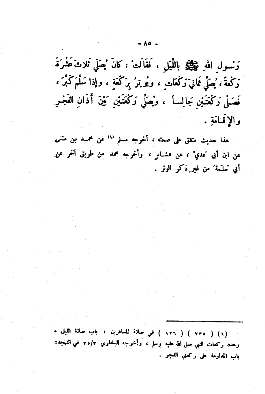 هَذَا حَدِيثٌ مُتَّفَقٌ عَلَى صِحَّتِهِ، أَخْرَجَهُ مُسْلِمٌ، عَنْ مُحَمَّدِ بْنِ مُثَنَّى، عَنِ ابْنِ أَبِي عَدِيٍّ، عَنْ هِشَامٍ، وَأَخْرَجَهُ مُحَمَّدٌ مِنْ طَرِيقٍ آخَرَ، عَنْ أَبِي سَلَمَةَ مِنْ غَيْرِ ذِكْرِ الْوِتْرِ